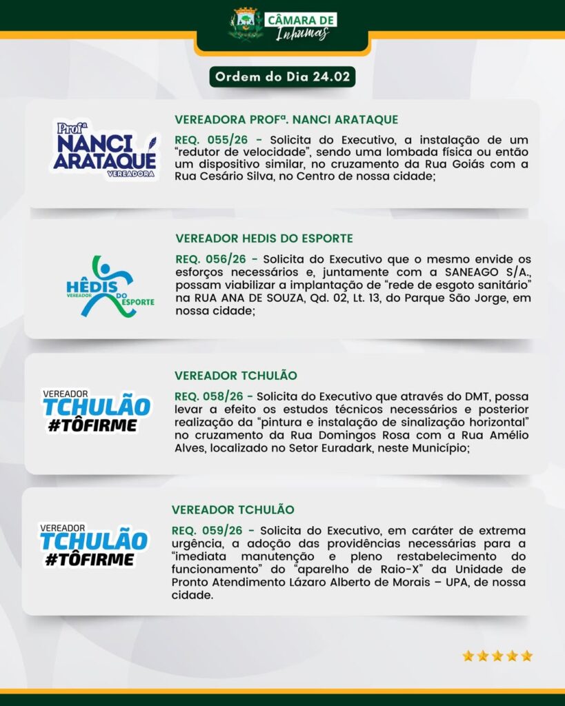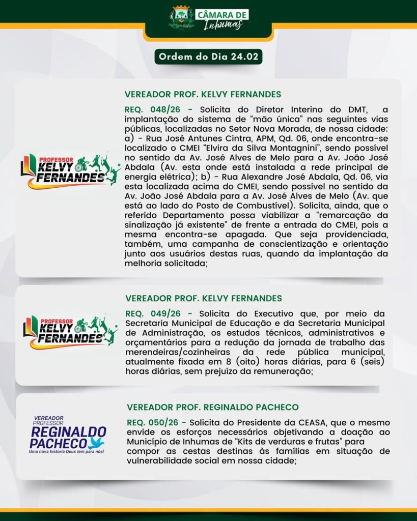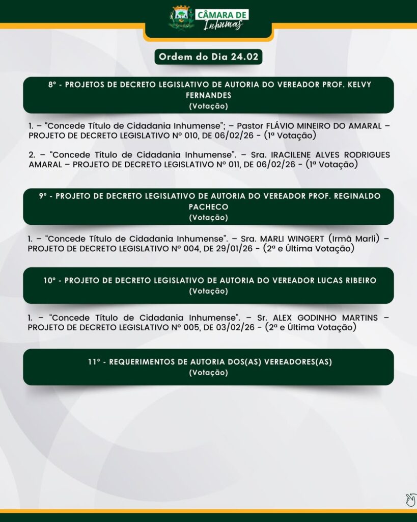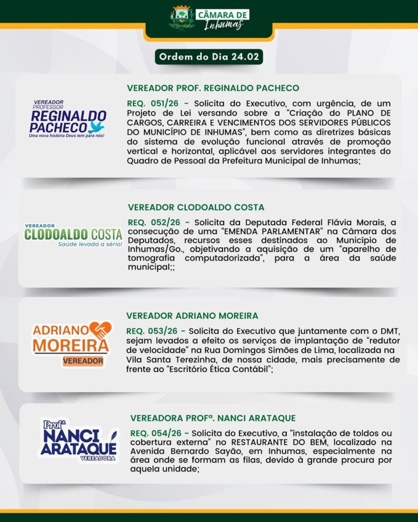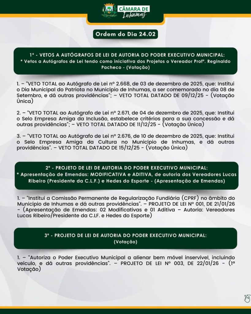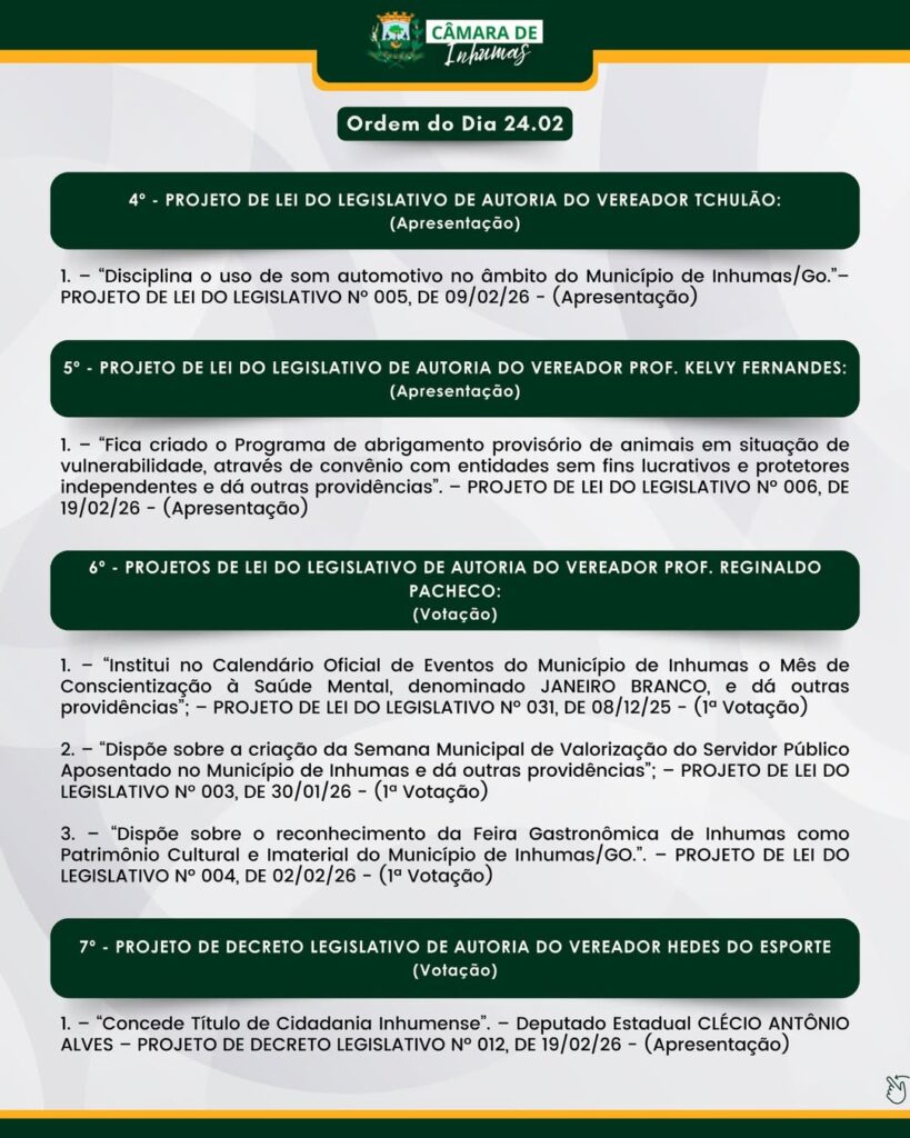 A Câmara Municipal de Inhumas informa que, na Sessão Ordinária realizada hoje, terça-feira, 24 de fevereiro, será apreciada a Pauta da Ordem do Dia, com a análise e deliberação das matérias legislativas em tramitação.