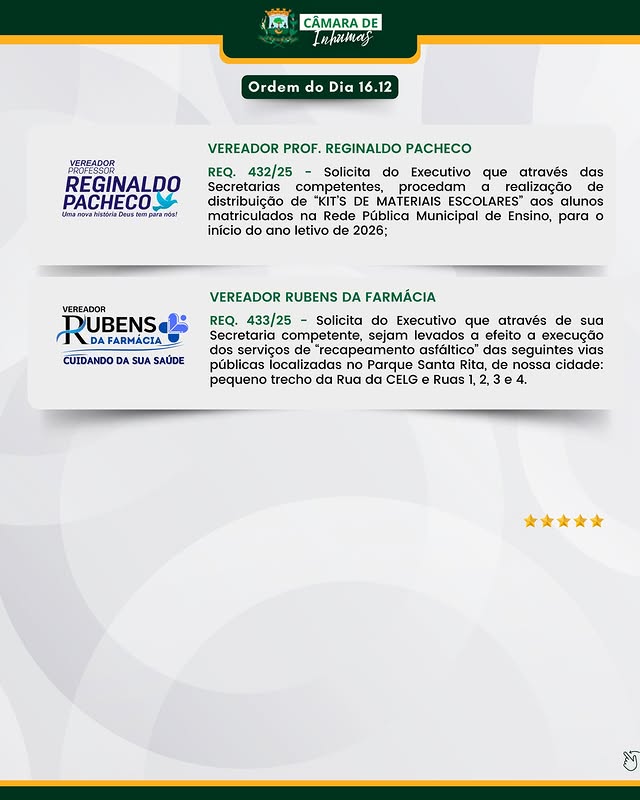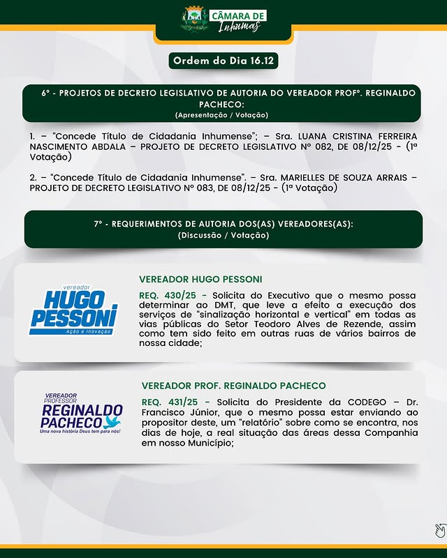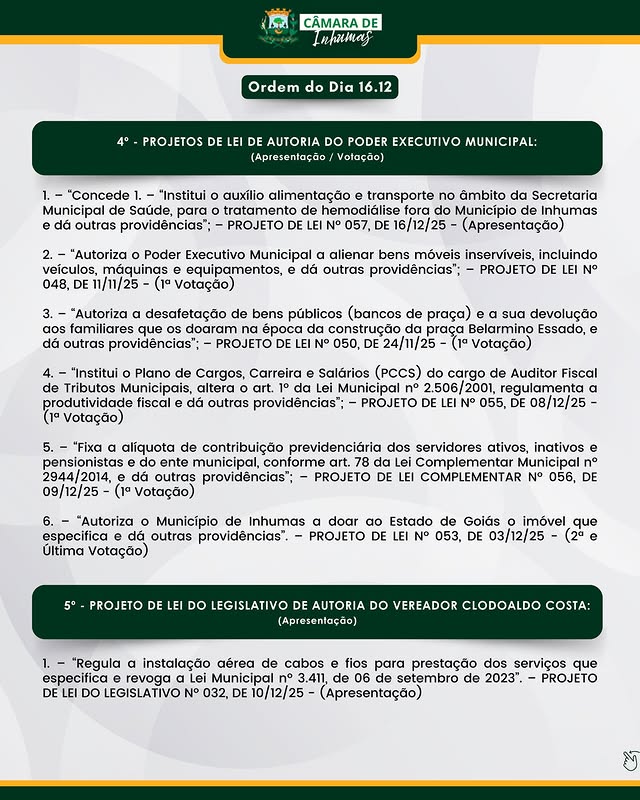 As proposições em pauta envolvem projetos de lei e requerimentos de interesse da população inhumense, reafirmando o compromisso do Poder Legislativo com a transparência, a responsabilidade e o desenvolvimento do municÃpio.