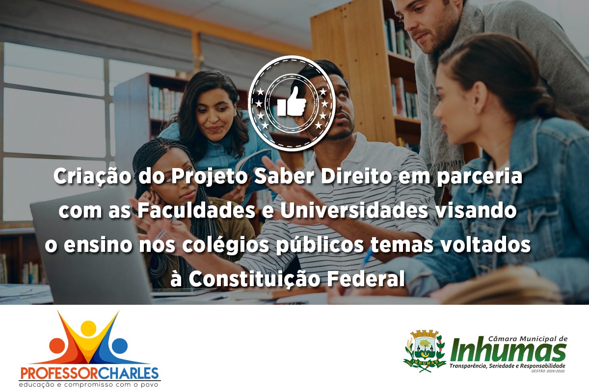 Aprovado por unanimidade durante “Sessão Ordinária”, realizada dia 12 de fevereiro na Câmara Municipal de Inhumas o “Requerimento de n. 046/19 do vereador PROFº. CHARLES MONTANINI que solicita do Executivo que faça gestões junto ao Secretário Municipal da Educação e ao Subsecretário Regional da Educação em Inhumas, para que seja instituído nas Escolas e Colégios da rede pública municipal e estadual, o “PROJETO SABER DIREITO”, em parceria com Faculdades e Universidades, visando a realização de aulas expositivas sobre Constituição Federal (Direitos Humanos e Deveres), Áreas de direito Público e Privado;