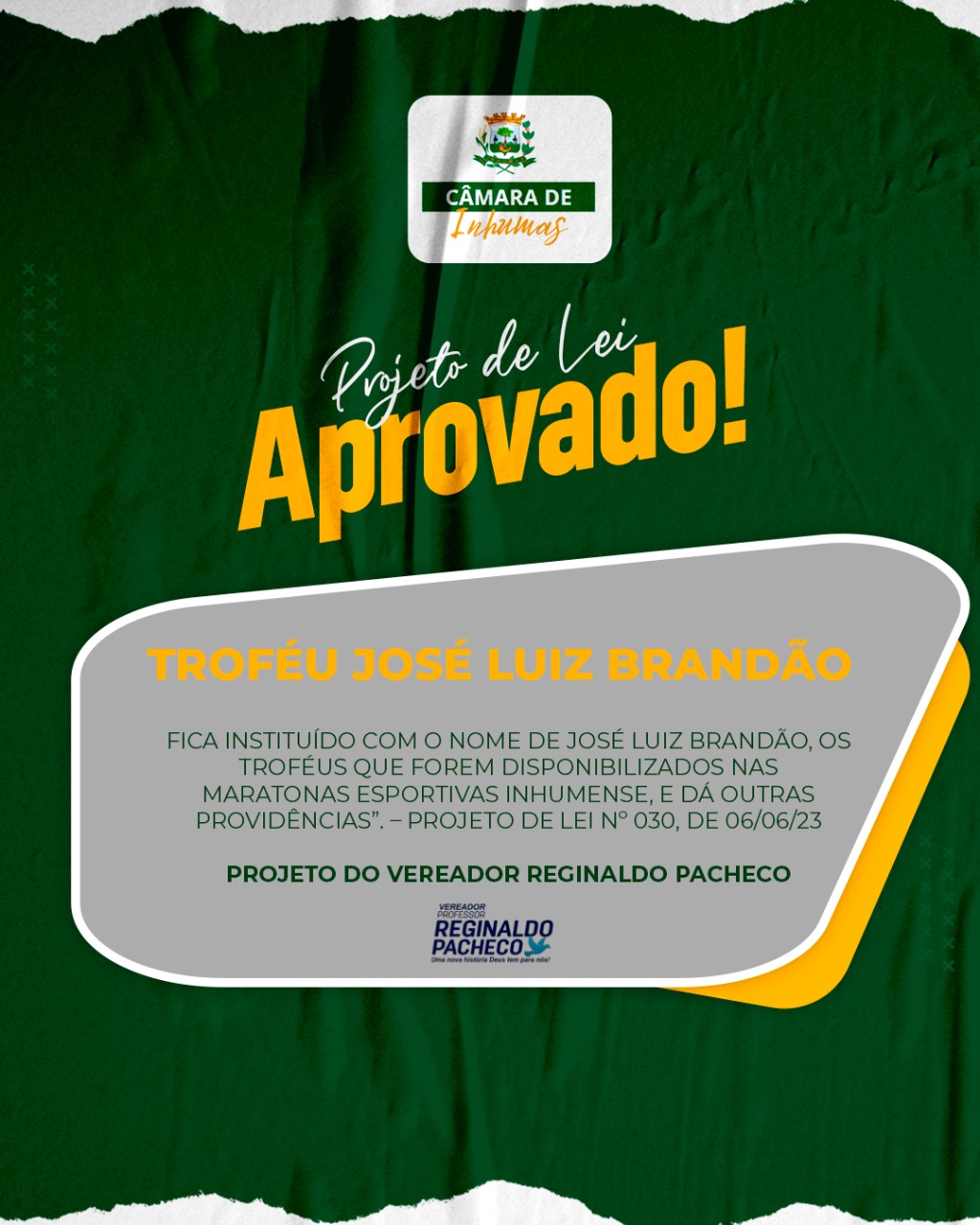 Fica instituído com o nome de José Luiz Brandão, os Troféus que forem disponibilizados nas Maratonas Esportivas Inhumense, e dá outras providências”. – PROJETO DE LEI Nº 030, DE 06/06/23. PROJETO DO VEREADOR REGINALDO PACHECO