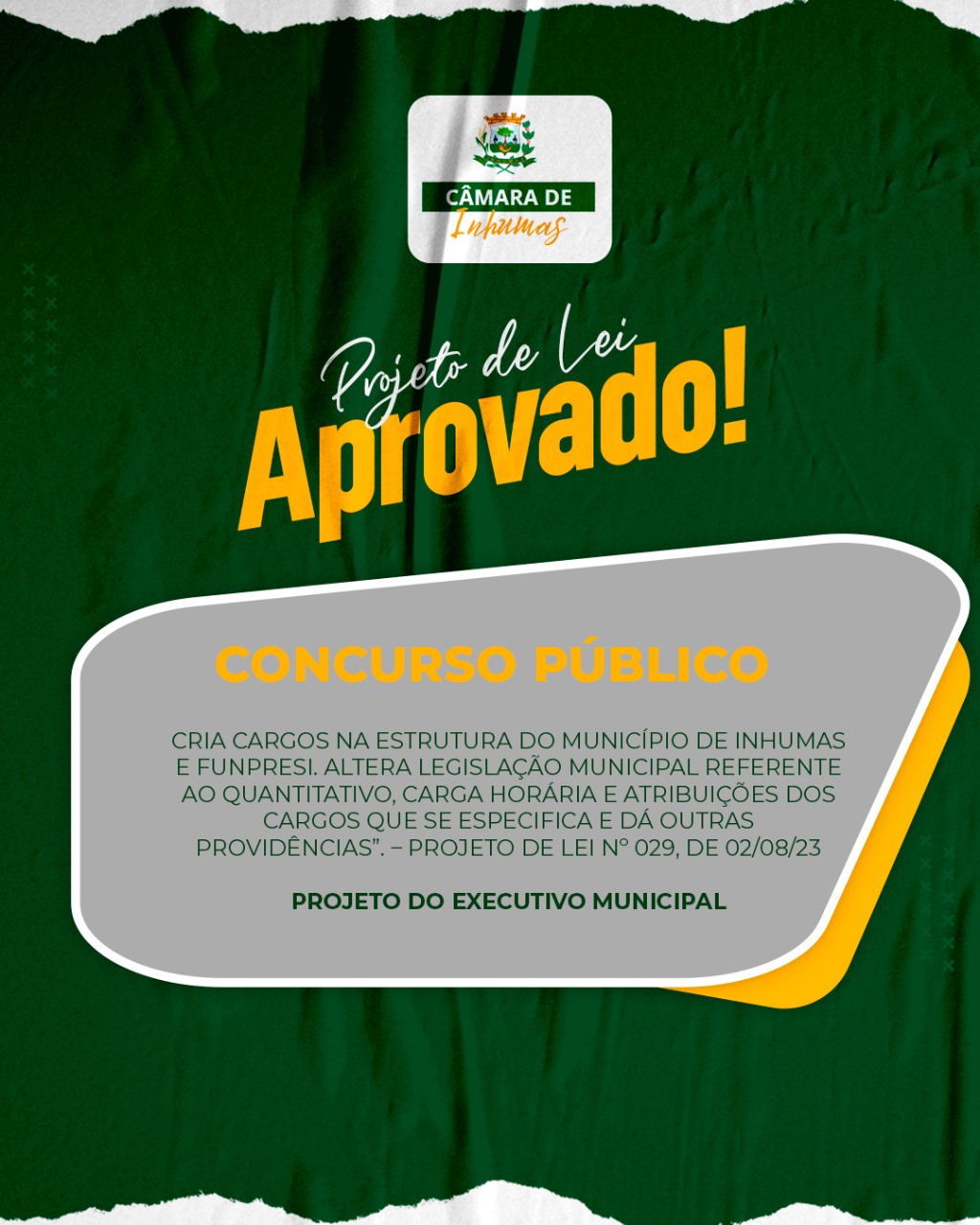Cria cargos na estrutura do Município de Inhumas e FUNPRESI. Altera legislação municipal referente ao quantitativo, carga horária e atribuições dos cargos que se especifica e dá outras providências”. – PROJETO DE LEI Nº 029, DE 02/08/23. EXECUTIVO MUNICIPAL.