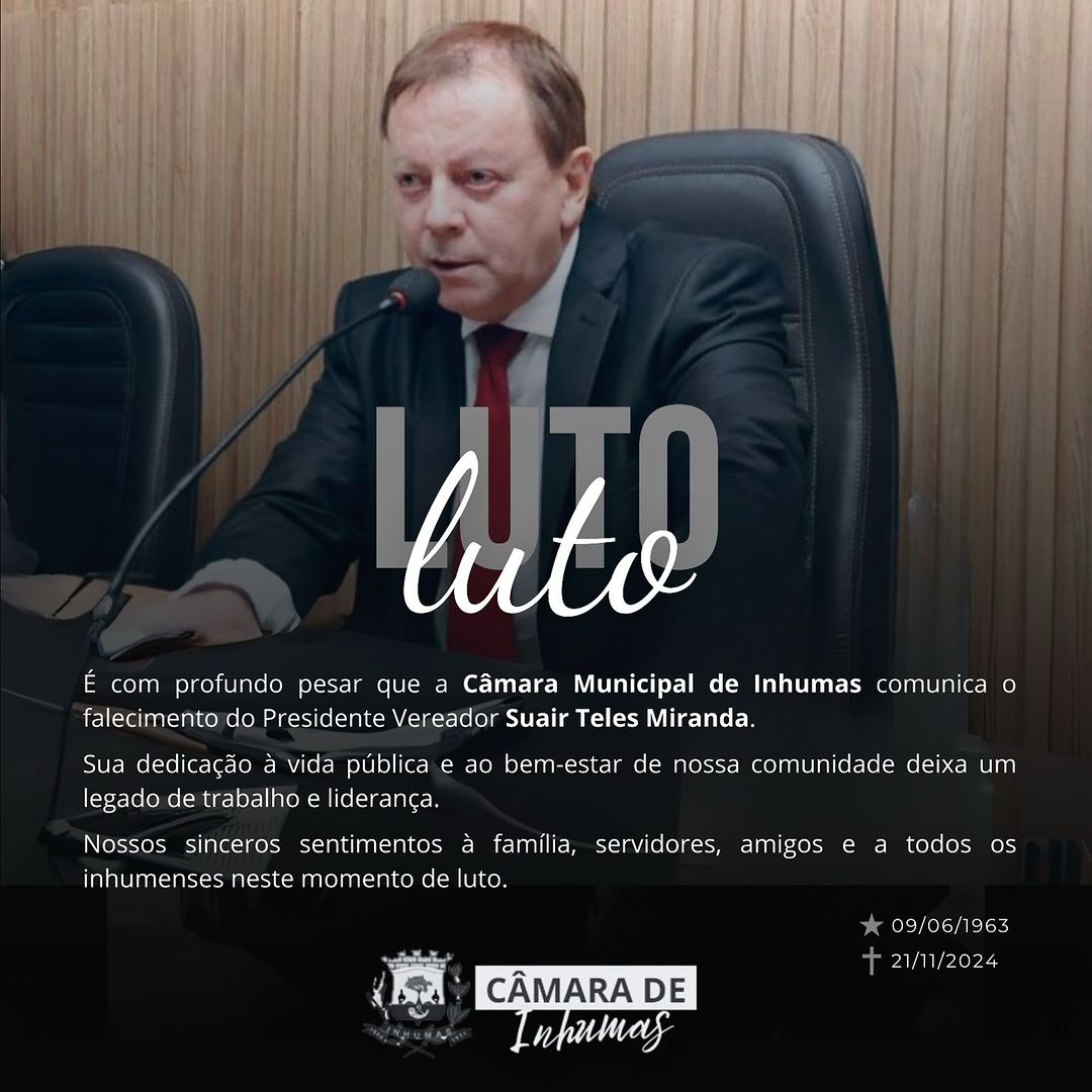 Com imenso pesar, a Câmara Municipal de Inhumas informa o falecimento do Presidente da Casa, Vereador Suair Teles Miranda, ocorrido nesta data.