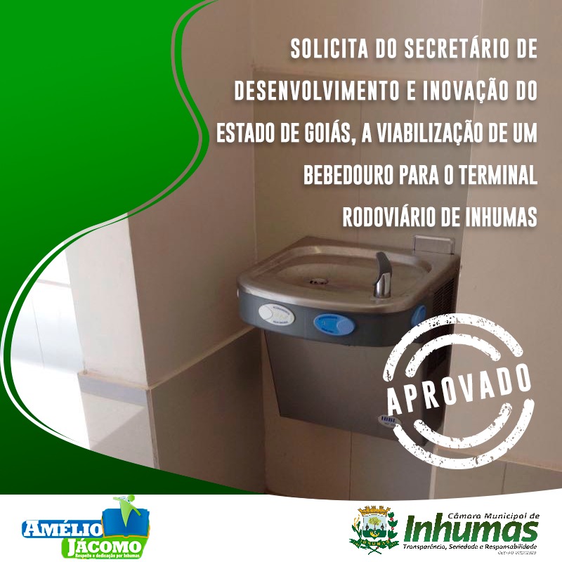 Foi aprovado por unanimidade na última sessão ordinária realizada dia 19 de Setembro de 2019, o Requerimento nº 325/19, de autoria do Vereador Amélio Jácomo (PP), onde solicita envio de expediente ao Secretário de Desenvolvimento e Inovação do estado de Goiás, o Sr. Adriano da Rocha Lima e a Secretária de Gestão e Planejamento do Município de Inhumas, a Sra. Fernanda Neto Valim, solicitando dos mesmos que seja disponibilizado para o “Terminal Rodoviário de Inhumas”, um bebedouro, objetivando alcançar um melhor atendimento ao cidadão, e ao usuário do transporte rodoviário ali prestado.