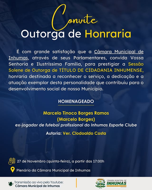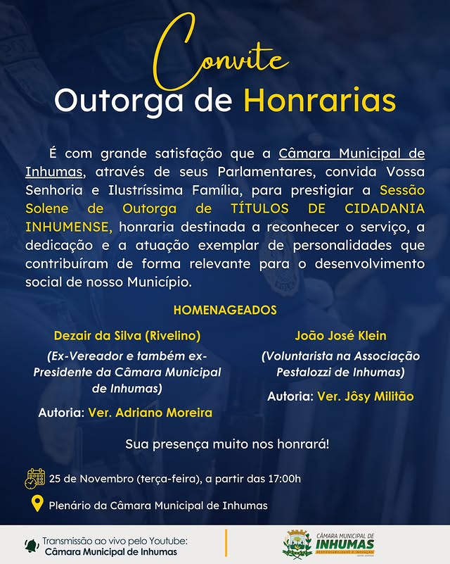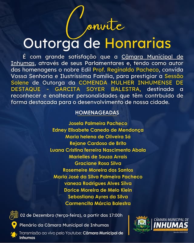 A Câmara Municipal de Inhumas tem a honra de convidar toda a população para a…