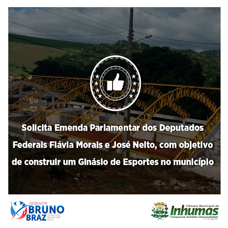 Aprovado por unanimidade em “Sessão Ordinária“ realizada dia 06 de Agosto, na Câmara Municipal de Inhumas, o “Requerimento n° 267/19“, do vereador Bruno Braz, que solicita o envio de expedienteaos Deputados Federais – Sr. José Nelto e Fávia Morais, solicitando dos mesmos que viabilizem “EMENDA PARLAMENTAR” de vossas autorias a fim de destiná-las a nossa municipalidade para a construção de um Ginásio de Esportes, pois nosso município carece de estruturas como esta para propiciar mais um local adequado para a realização de atividades esportivas.
