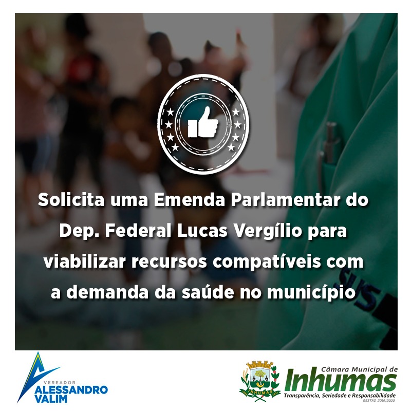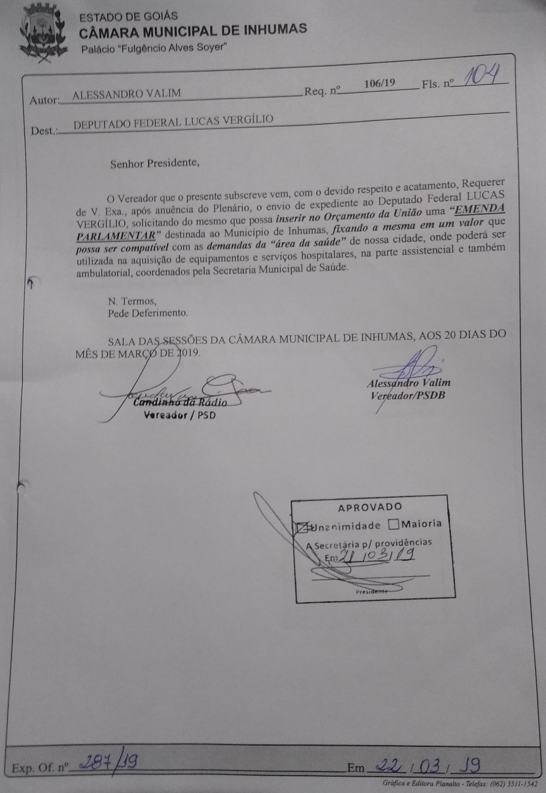 Aprovado por unanimidade em “Sessão Ordinária“ realizada dia 21 de Março, na Câmara Municipal de Inhumas, o “Requerimento n° 106/19“, do vereador Alessandro Valim (PSDB), que solicita o envio de expediente ao Deputado Federal LUCAS VERGÍLIO, solicitando do mesmo que possa inserir no Orçamento da União uma “EMENDA PARLAMENTAR” destinada ao Município de Inhumas, fixando a mesma em um valor que possa ser compatível com as demandas da “área da saúde” de nossa cidade, onde poderá ser utilizada na aquisição de equipamentos e serviços hospitalares, na parte assistencial e também ambulatorial, coordenados pela Secretaria Municipal de Saúde