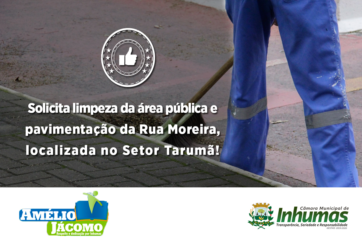 Aprovado por unanimidade em “Sessão Ordinária“ realizada dia26 de Fevereiro, na Câmara Municipal de Inhumas, o “Requerimento n° 072/19“,  do vereador Amélio Jácomo (PROGRESSISTA), que solicita o envio de expedienteao Chefe do Poder Executivo Municipal,  a limpeza da área públicapavimentação da Rua Moreira, Qd.05, Lt. 14, Setor Tarumã, em nossa cidade.