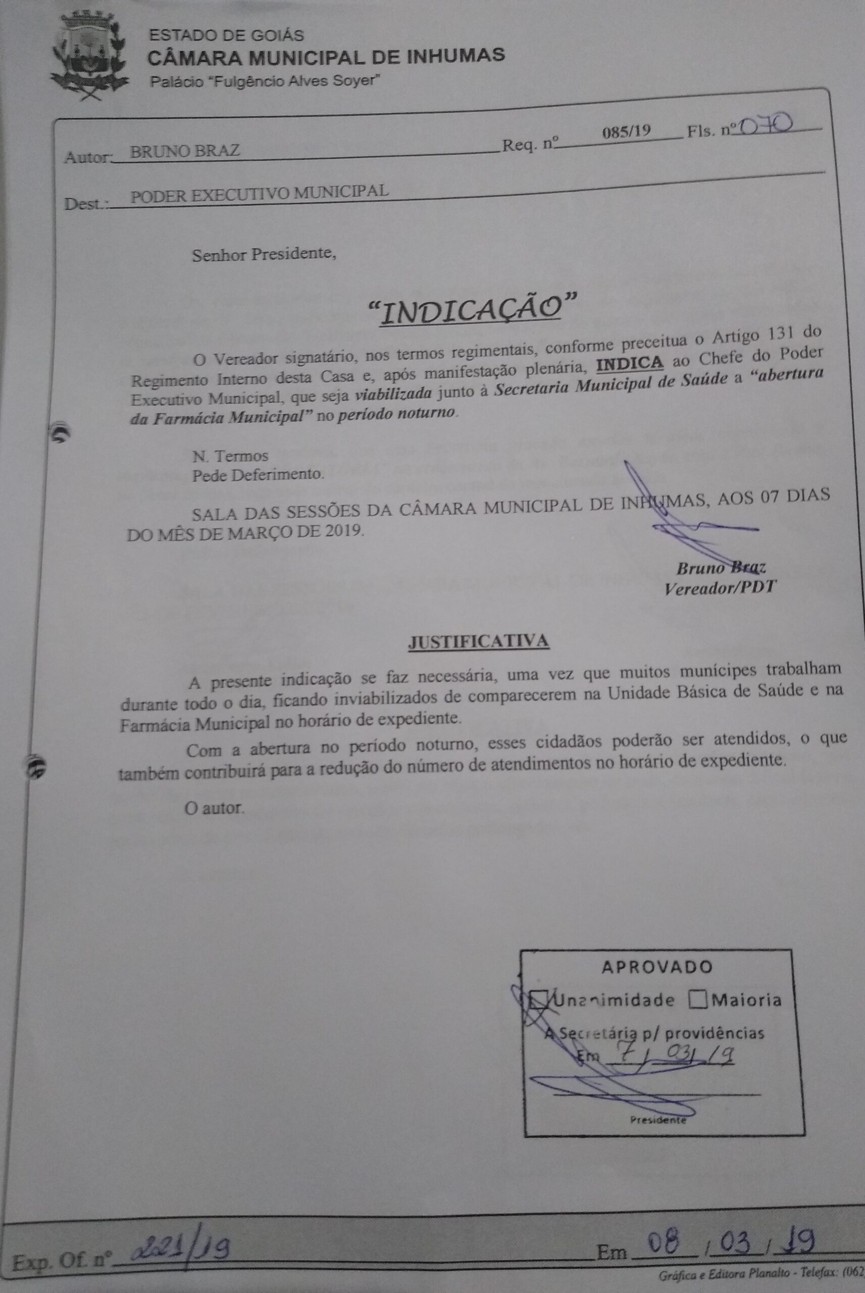 Aprovado por unanimidade em “Sessão Ordinária“ realizada dia07 de Março, na Câmara Municipal de Inhumas, a “INDICAÇÃO n° 085/19“, do vereador Bruno Braz (PDT), que INDICA ao Chefe do Poder Executivo Municipal, que seja viabilizada junto à Secretaria Municipal de Saúde a “abertura da Farmácia Municipal” no período noturno.