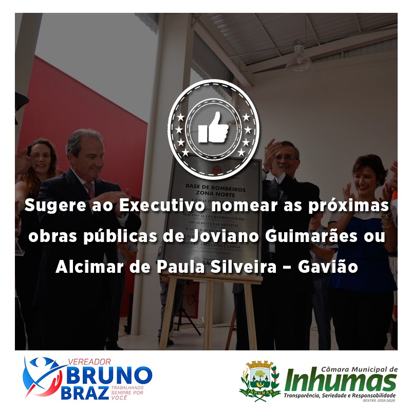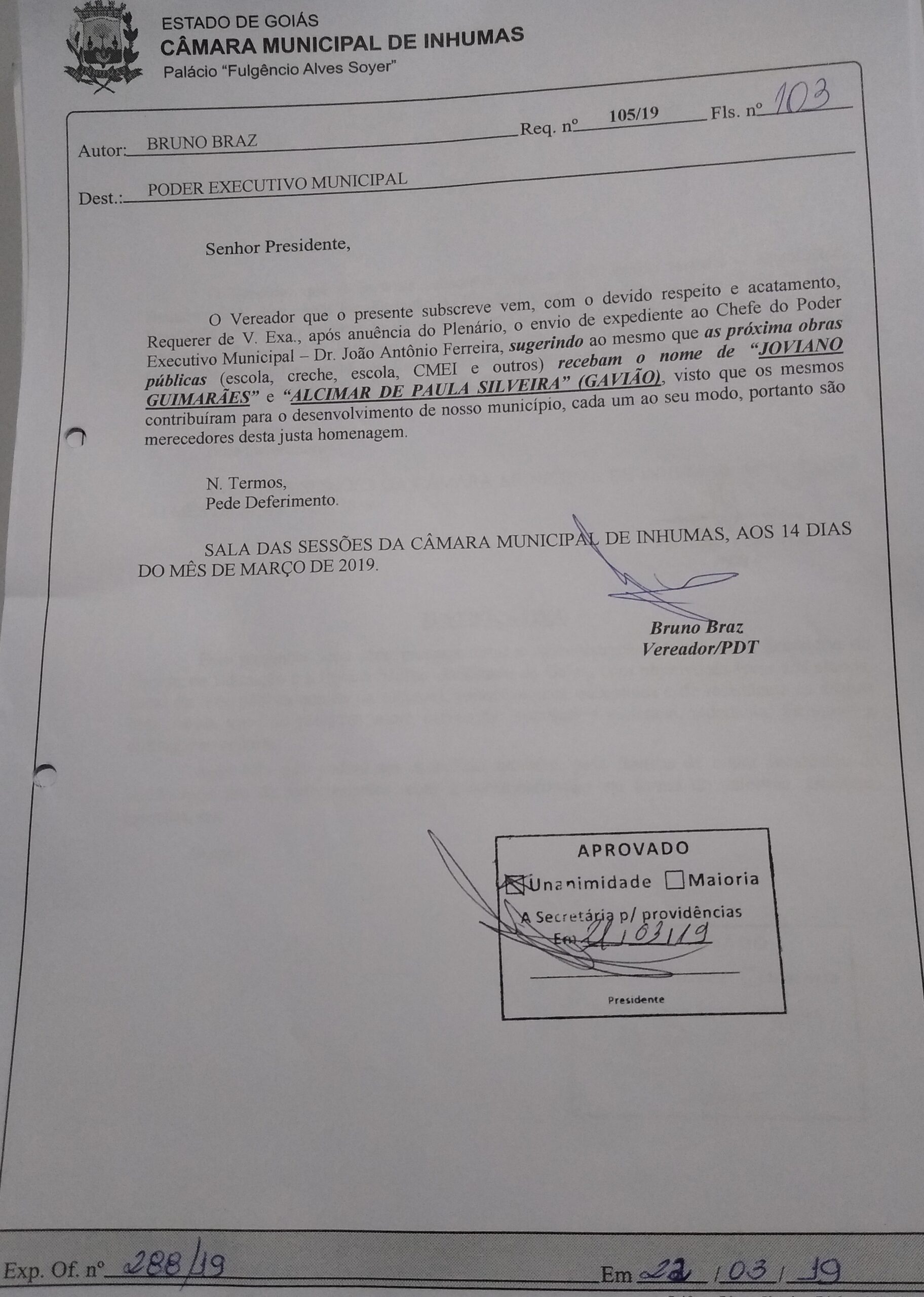 Aprovado por unanimidade em “Sessão Ordinária“ realizada dia 21 de Março, na Câmara Municipal de Inhumas,  o “Requerimento n° 105/19“,  do vereador Bruno Braz (PDT), que solicita o envio de expediente ao Chefe do Poder Executivo Municipal – Dr. João Antônio Ferreira, sugerindo ao mesmo que as próxima obras públicas (escola, creche, escola, CMEI e outros) recebam o nome de “JOVIANO GUIMARÃES” e “ALCIMAR DE PAULA SILVEIRA” (GAVIÃO), visto que os mesmos contribuíram para o desenvolvimento de nosso município, cada um ao seu modo, portanto são merecedores desta justa homenagem.