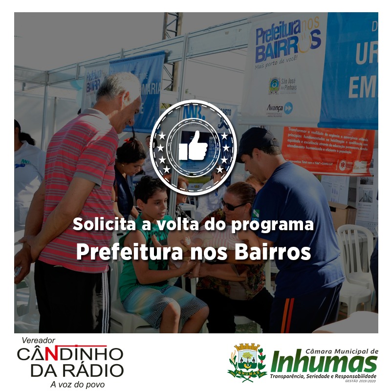Aprovado por unanimidade em “Sessão Ordinária“ realizada dia 21 de Março, na Câmara Municipal de Inhumas, o “Requerimento n° 111/19“, do vereador Candinho da Rádio (PSD), que solicita o envio de expediente ao Chefe do Poder Executivo Municipal, solicitando do mesmo que juntamente com sua Secretaria competente e, com a volta do Programa de Ação…