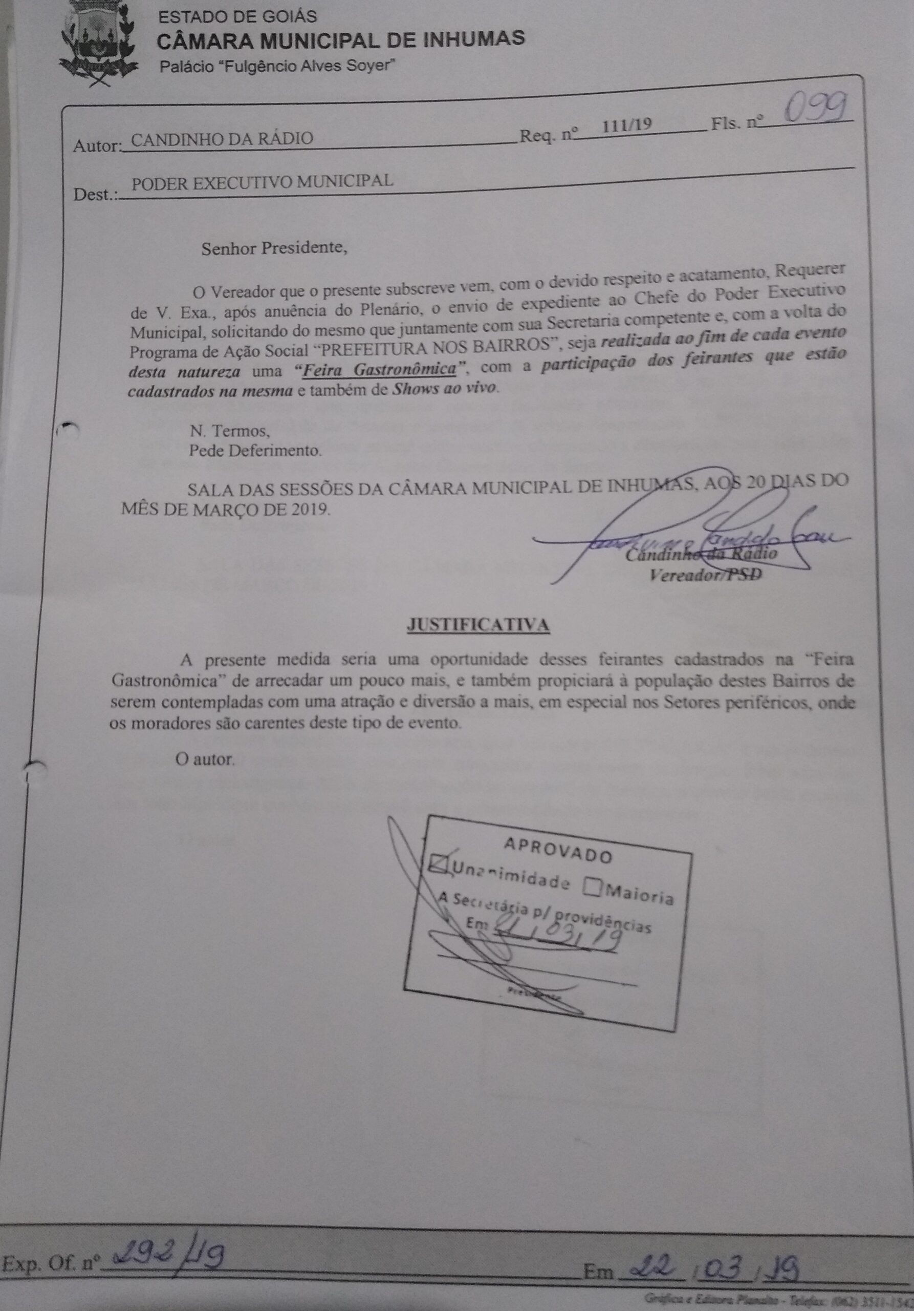 Aprovado por unanimidade em “Sessão Ordinária“ realizada dia 21 de Março, na Câmara Municipal de Inhumas, o “Requerimento n° 111/19“, do vereador Candinho da Rádio (PSD), que solicita o envio de expediente ao Chefe do Poder Executivo Municipal, solicitando do mesmo que juntamente com sua Secretaria competente e, com a volta do Programa de Ação Social “PREFEITURA NOS BAIRROS”, seja realizada ao fim de cada evento desta natureza uma “Feira Gastronômica”, com a participação dos feirantes que estão cadastrados na mesma e também de Shows ao vivo.
