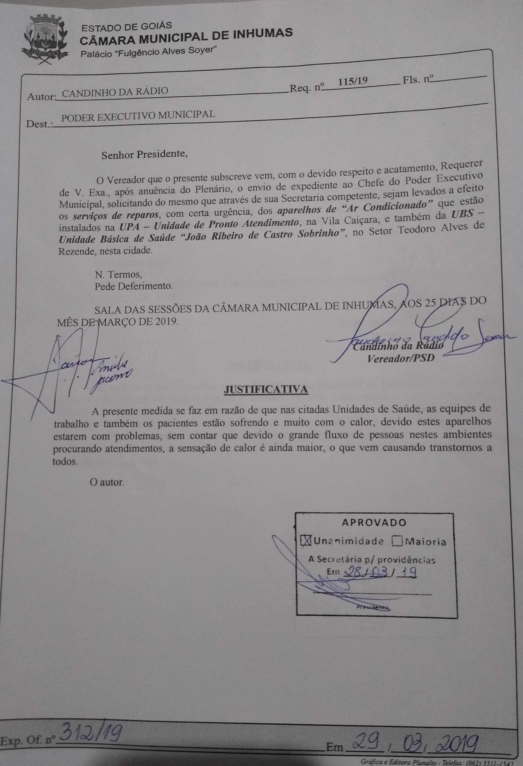 Aprovado por unanimidade em “Sessão Ordinária“ realizada dia de Março, na Câmara Municipal de Inhumas, o “Requerimento n° 115/19“, do vereador Candinho da Rádio (PSD) , que solicita o envio de expediente ao Chefe do Poder Executivo Municipal, solicitando do mesmo que através de sua Secretaria competente, sejam levados a efeito os serviços de reparos, com certa urgência, dos aparelhos de “Ar Condicionado” que estão instalados na UPA – Unidade de Pronto Atendimento, na Vila Caiçara, e também da UBS – Unidade Básica de Saúde “João Ribeiro de Castro Sobrinho”, no Setor Teodoro Alves de Rezende, em Inhumas.