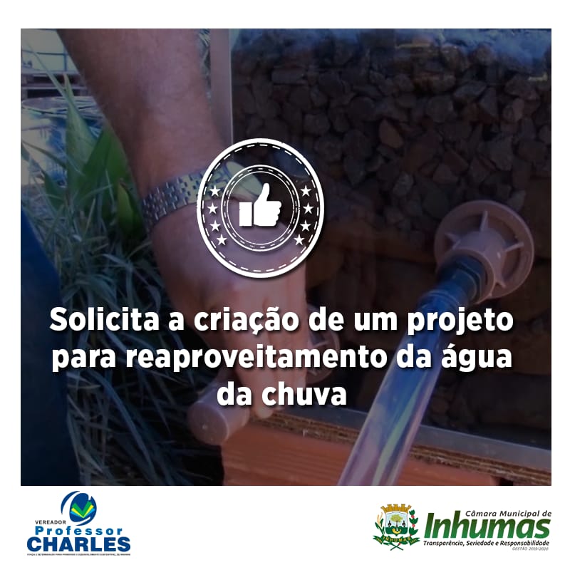 Aprovado por unanimidade em “Sessão Ordinária“ realizada dia 14 de Março, na Câmara Municipal de Inhumas, o “Requerimento n° 101/19“, do vereador Charles Montanini (PDT) , que solicita o envio de expediente ao Chefe do Poder Executivo Municipal, solicitando do mesmo que encaminhe a esta Casa de Leis, Projeto de Lei versando sobre a captação e o reaproveitamento das águas da chuva nas construções acima de 120 m2, visando à sustentabilidade das mesmas. Sugeriu-se que toda água captada deverá ser tratada e utilizada somente para fins restritos de limpeza, jardinagem e para descargas de vasos sanitários, sendo terminantemente vedado, o seu uso para o consumo humano. O Projeto desta Obra deverá ser adequado às caixas de armazenamento e compatíveis com a área construída, objetivando a proporcionalidade. No requerimento o autor justifica que a media será importante pois tornar a cidade cada vez mais sustentável será uma importante ação que resultará na economia no bolso da população e a preservação de nossos recursos hídricos.