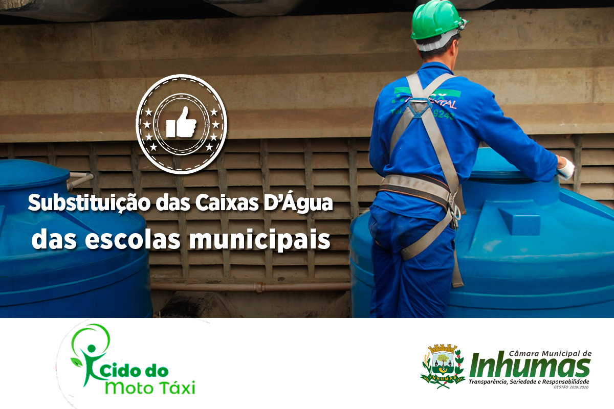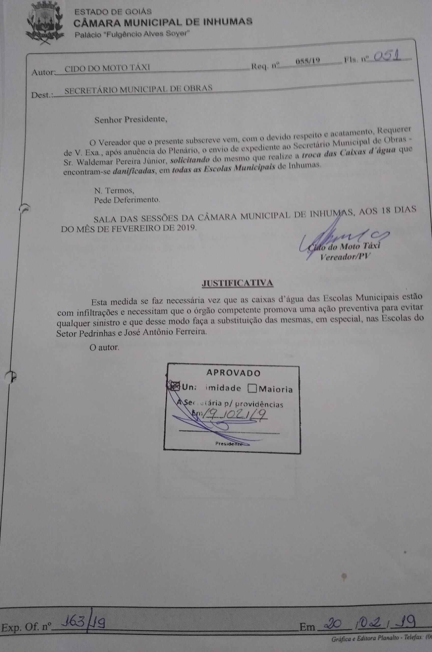 Aprovado por unanimidade em “Sessão Ordinária“ realizada dia 19 de Fevereiro, na Câmara Municipal de Inhumas, o “Requerimento n° 055/19“, do vereador Cido do Moto Taxi (PV), que solicita o envio de expediente ao Secretário Municipal de Obras – Sr. Waldemar Pereira Júnior, solicitando do mesmo que realize a troca das Caixas d´água que encontram-se danificadas, em todas as Escolas Municipais de Inhumas.