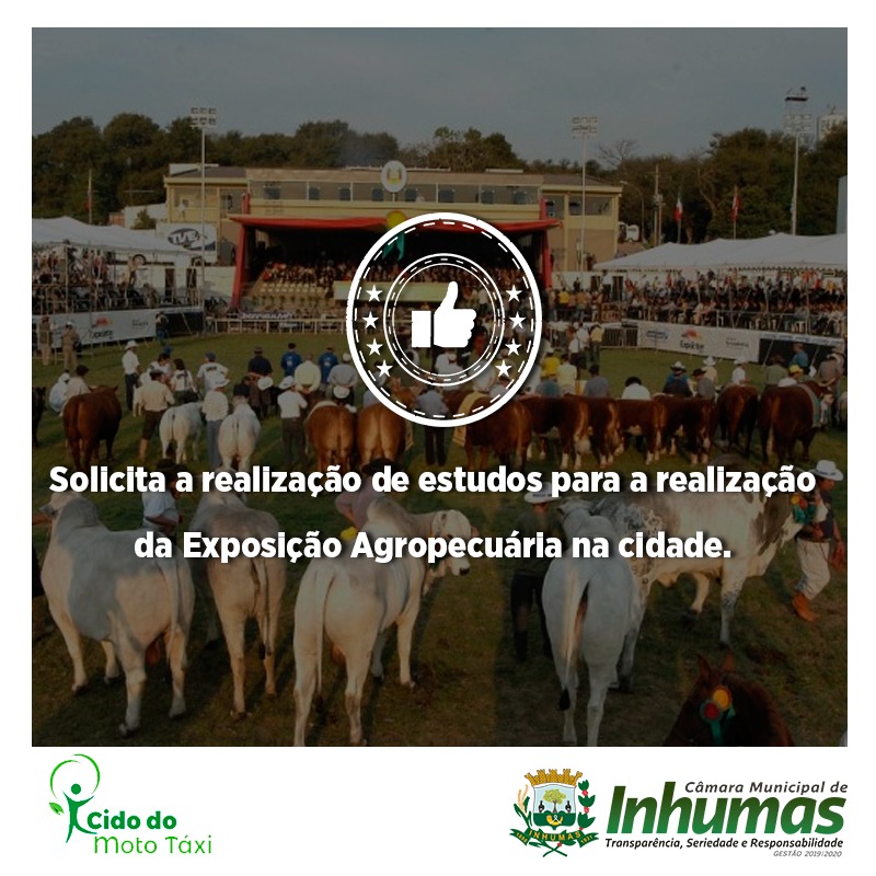 Aprovado por unanimidade em “Sessão Ordinária“ realizada dia 04 de Junho, na Câmara Municipal de Inhumas, o “Requerimento n° 213/19“, do vereador Cido do Moto Taxi – PV, que solicita o envio de expediente ao Chefe do Poder Executivo Municipal, solicitando do mesmo que faça gestões junto ao Sindicato Rural de Inhumas e ao Governo do Estado de Goiás, para que possam viabilizar estudos objetivando, conjuntamente, a realização das festividades da “Exposição Agropecuária de Inhumas”, a qual não é realizada em nossa cidade há vários anos. De acordo com o requerimento o vereador ainda sugere, “havendo a possibilidade da realização deste evento, que o promotor da Exposição Agropecuária faça o possível para que seja incluído na programação da mesma, atrações com cantores e músicos de nossa cidade, bem como de outras atrações de renome nacional para apresentações no citado evento”.