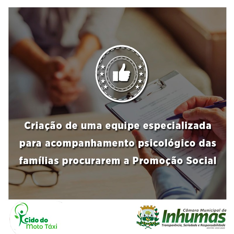 Aprovado por unanimidade em “Sessão Ordinária“ realizada dia 09 de Abril, na Câmara Municipal de Inhumas, o “Requerimento n° 136/19“, do vereador Cido do MotoTaxi (PV), que solicita o envio de expediente a Secretária Municipal de Promoção Social – Dra. Helena Bites de Carvalho Ferreira, solicitando da mesma que possa designar uma equipe para que, mensalmente, sejam “realizadas terapias” com acompanhamentos de psicólogas, assistentes sociais e demais profissionais da área, objetivando atender pessoas que necessitam e buscam este atendimento naquela Pasta.