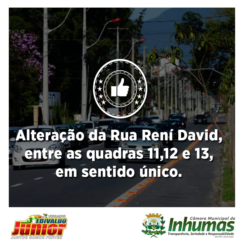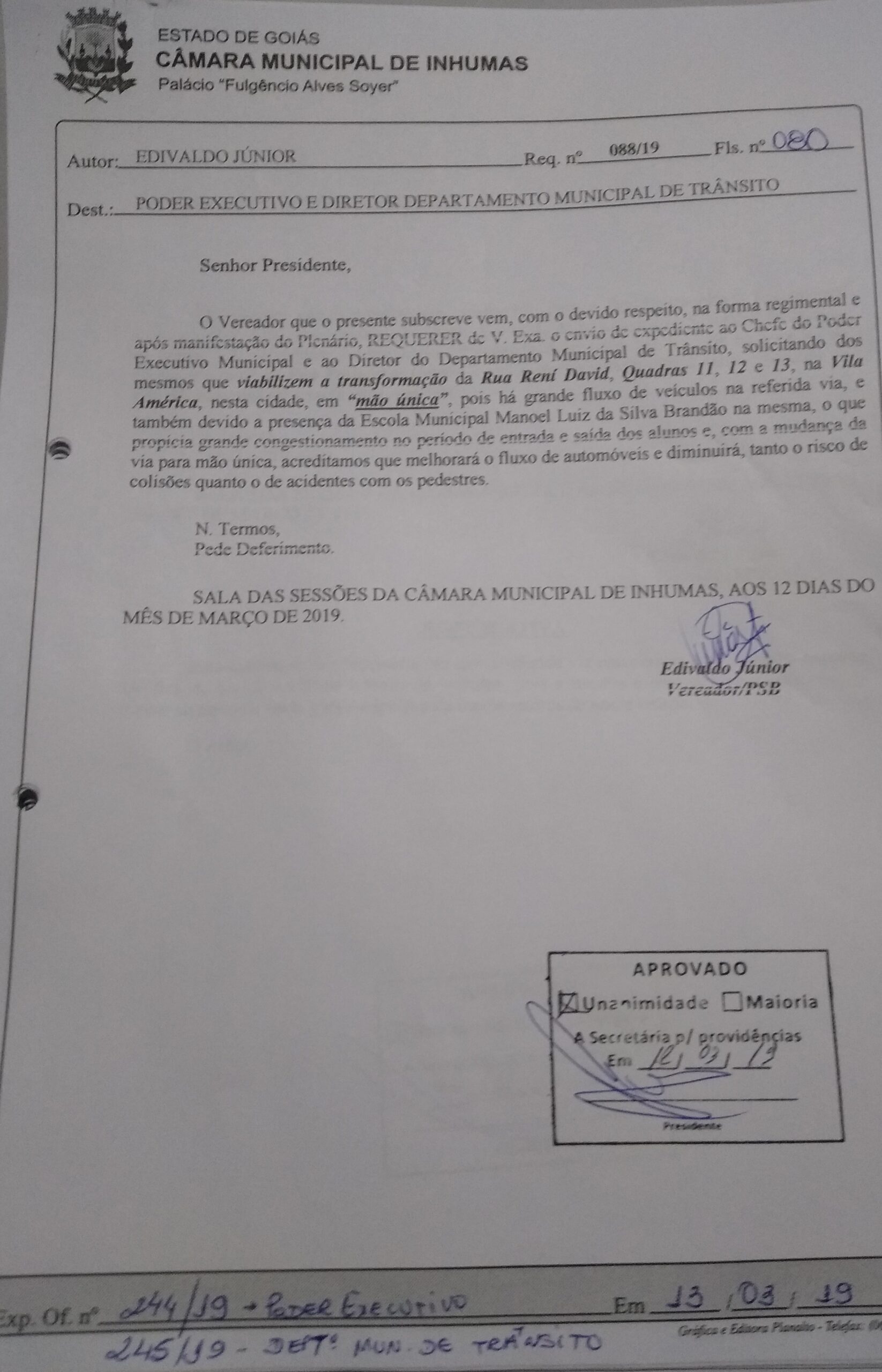 Aprovado por unanimidade em “Sessão Ordinária“ realizada dia 12 de Março, na Câmara Municipal de Inhumas, o “Requerimento n° 088/19“, do vereador Edivaldo Junior (PSB), que solicita o envio de expediente ao Chefe do Poder Executivo Municipal e ao Diretor do Departamento Municipal de Trânsito, solicitando dos mesmos que viabilizem a transformação da Rua Rení…