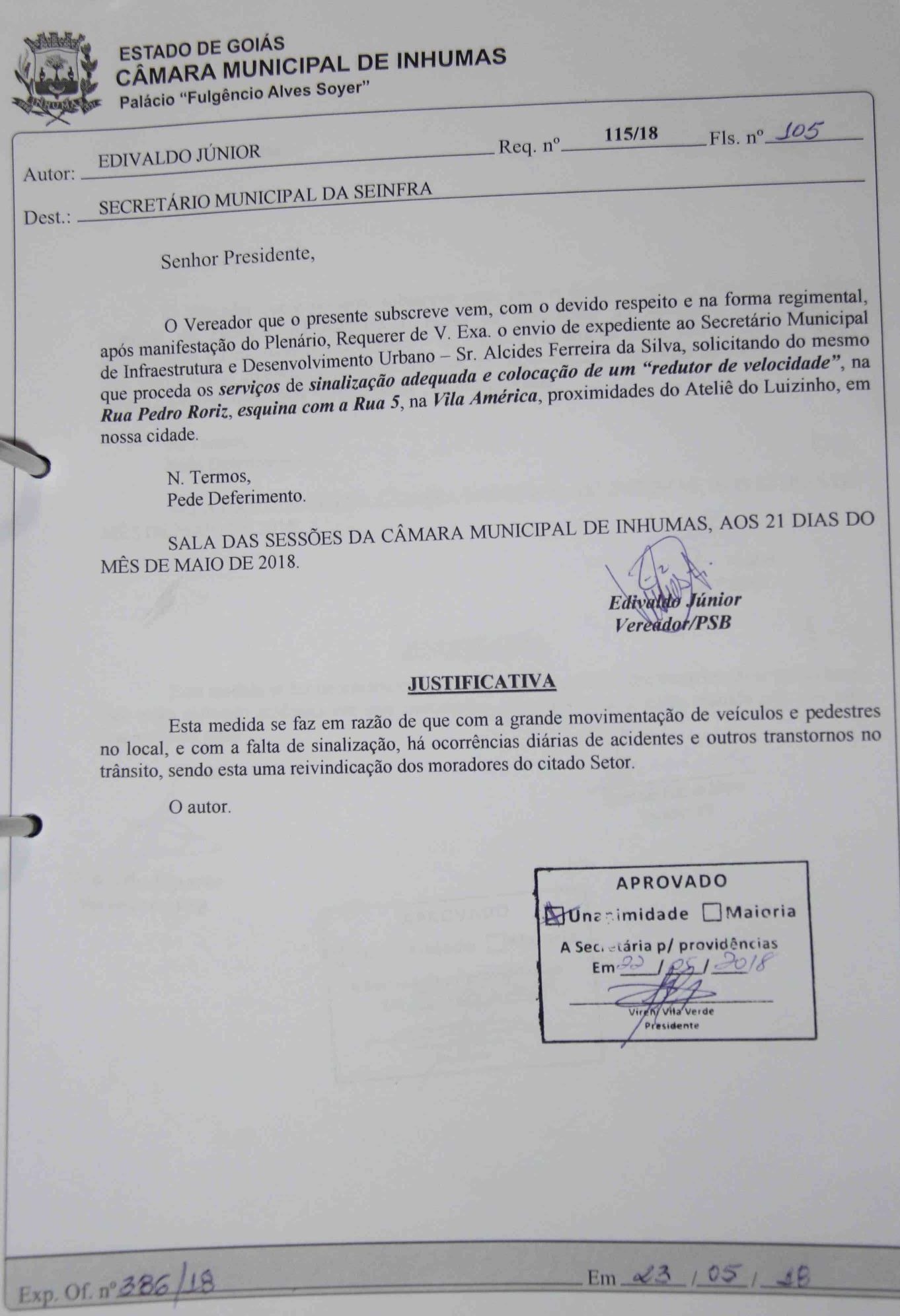 Aprovado por unanimidade o requerimento 115/18, do vereador Edivaldo Júnior (PSB), durante “Sessão Ordinária” realizada dia 22, o vereador solicitou o envio de expediente ao Secretário Municipal de Infraestrutura e Desenvolvimento Urbano da cidade de Inhumas, Sr. Alcides Ferreira da Silva, sugerindo que realize os serviços de sinalização adequada e colocação de um “redutor de velocidade”, na Rua Pedro Roriz, esquina com a Rua 5, na Vila América, proximidades do estúdio do Luizinho.