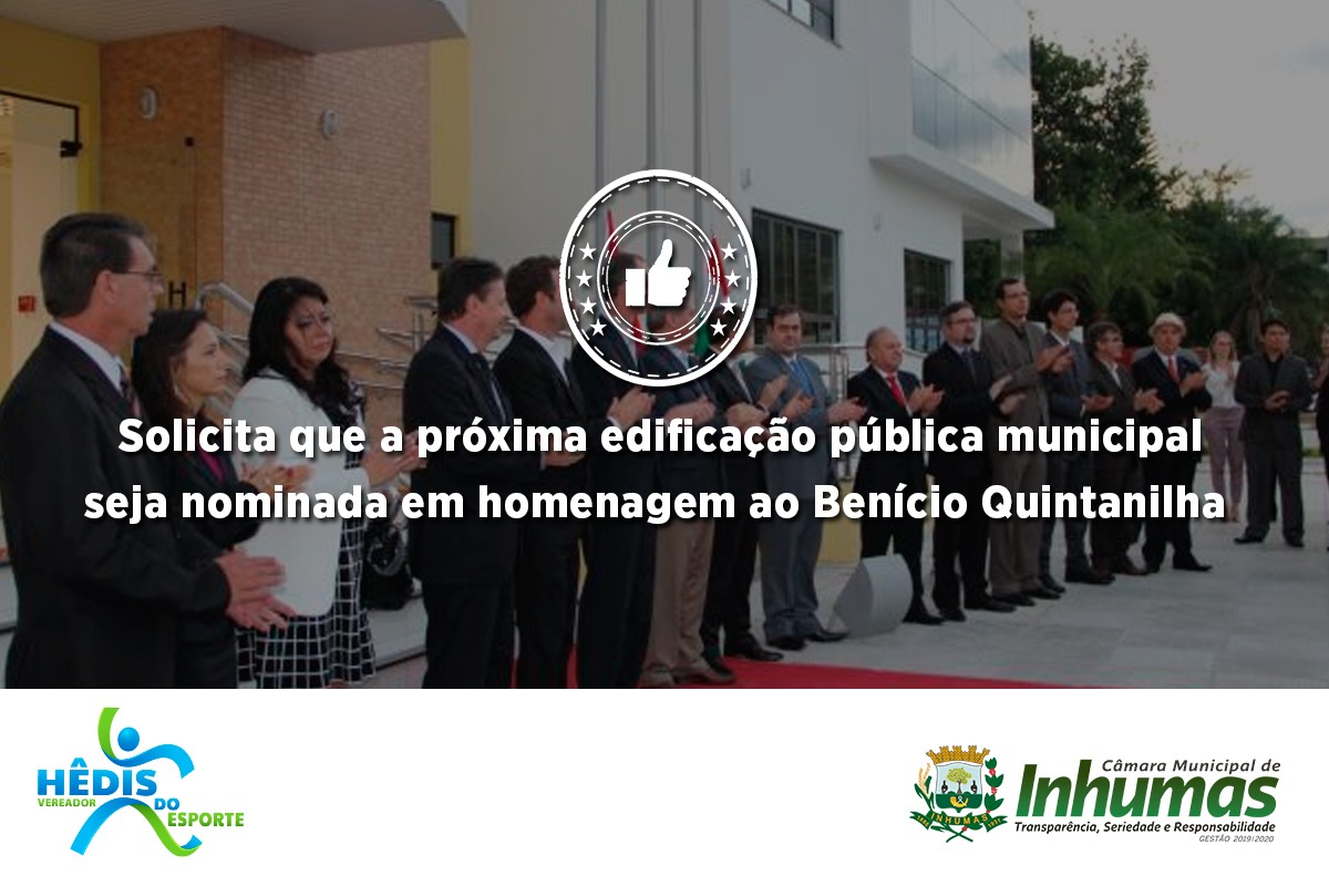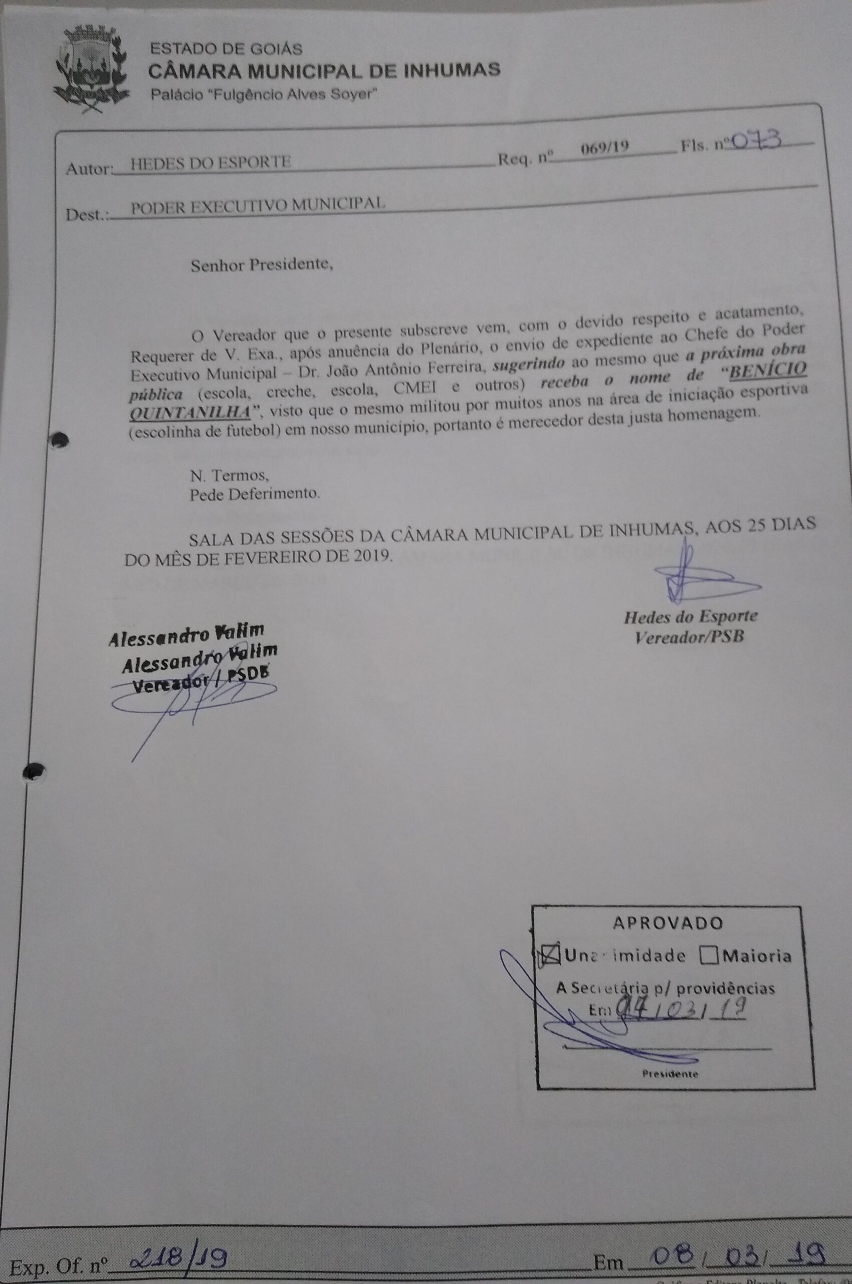 Aprovado por unanimidade em “Sessão Ordinária“ realizada dia07 de Março, na Câmara Municipal de Inhumas, o “Requerimento n° 069/19“, do vereador Hedes do Esporte (PSB), que solicita o envio de expediente ao Chefe do Poder Executivo Municipal – Dr. João Antônio Ferreira, sugerindo ao mesmo que a próxima obra pública (escola, creche, escola, CMEI e outros) receba o nome de “BENÍCIO QUINTANILHA”, visto que o mesmo militou por muitos anos na área de iniciação esportiva (escolinha de futebol) em nosso município, portanto é merecedor desta justa homenagem