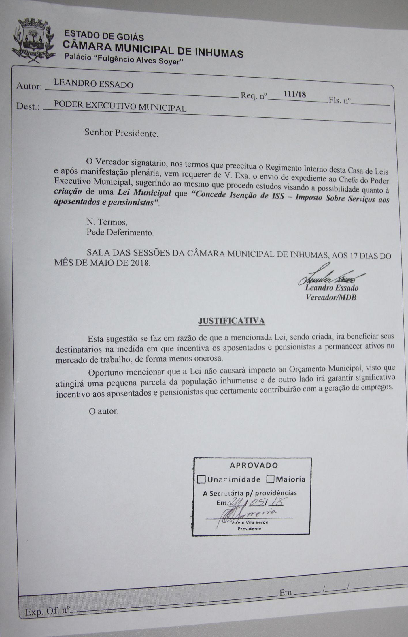 Requerimento de n. 111/18 do vereador Leandro Essado (MDB), foi aprovado por unanimidade durante “Sessão Ordinária”, realizada dia 24, na Câmara Municipal de Inhumas, o vereador requer o envio de expediente ao Chefe do Poder Executivo Municipal, sugerindo ao mesmo que proceda estudos visando a possibilidade quanto à criação de uma Lei Municipal que “Concede Isenção de ISS – Imposto Sobre Serviços aos aposentados e pensionistas”.