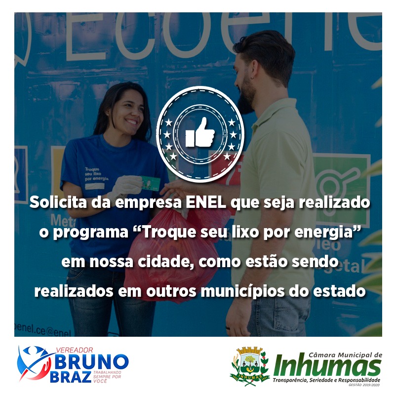 Vereador Presidente Bruno Braz(PDT), solicita ao Presidente da ENEL estudos para instalação de local apropriado para realização do “PROGRAMA DA ENEL TROQUE SEU LIXO POR ENERGIA”