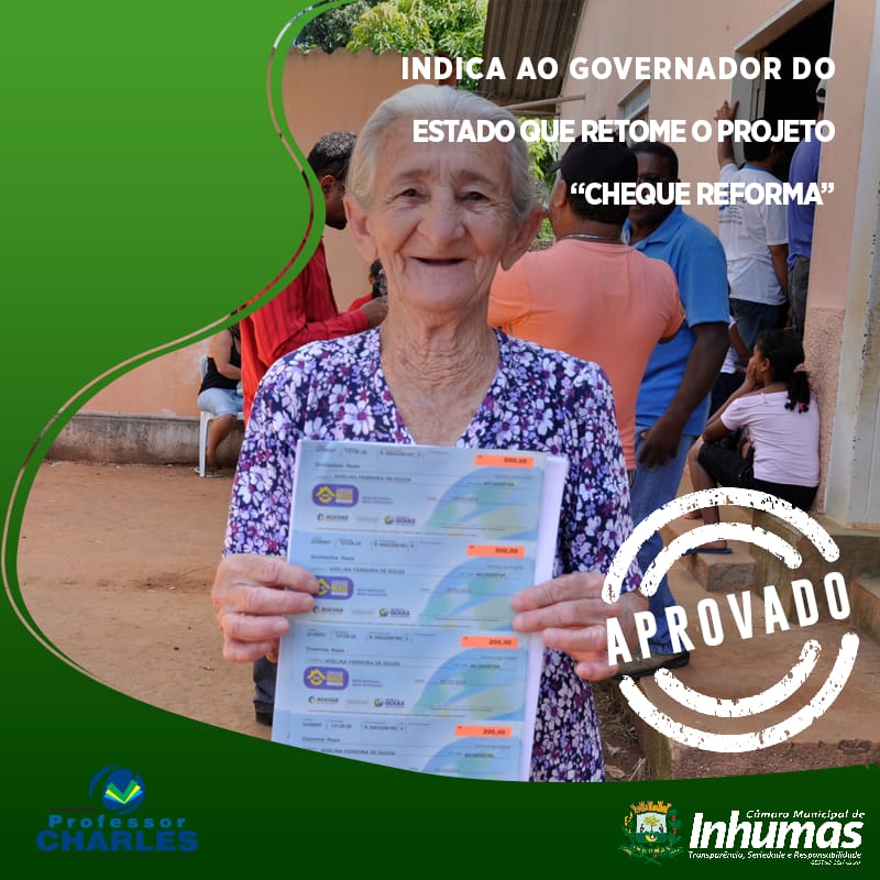 Foi aprovado por unanimidade durante sessão realizada na Câmara Municipal de Inhumas, no último dia 20 de Agosto de 2019, o Requerimento de nº.281/19, de autoria do Vereador Professor Charles (PDT), onde o mesmo INDICA ao Chefe do Poder Executivo Estadual – Dr. Ronaldo Ramos Caiado, que o mesmo retome o importante Programa de apoio às famílias carentes – “Cheque Reforma”, este auxílio trouxe melhores condições de vida a milhares de famílias carentes em todo o Estado.