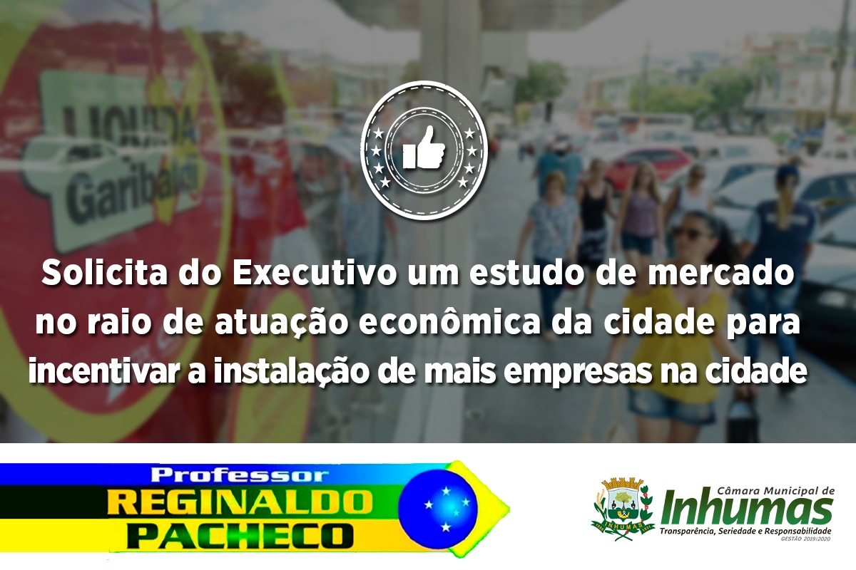 Aprovado por unanimidade em “Sessão Ordinária“ realizada dia14 de Fevereiro, na Câmara Municipal de Inhumas, o “Requerimento n° 051/19“, do vereador Prof. Reginaldo Pacheco (PSL), que solicita o envio de expedienteao Chefe do Poder Executivo Municipal, solicitando do mesmo que através da Secretaria competente, proceda os serviços de Consultoria para que se faça um estudo de mercado num raio de 100 KM, com objetivo se serem apresentadas as maiores características de Empresas demandadas para a região de Inhumas, bem como apresentar quais as melhores possibilidades para atender estas demandas, e com isso, abrindo novas Empresas e Indústrias e, consequentemente, gerando mais empregos e impulsionando o mercado interno de nosso Município.