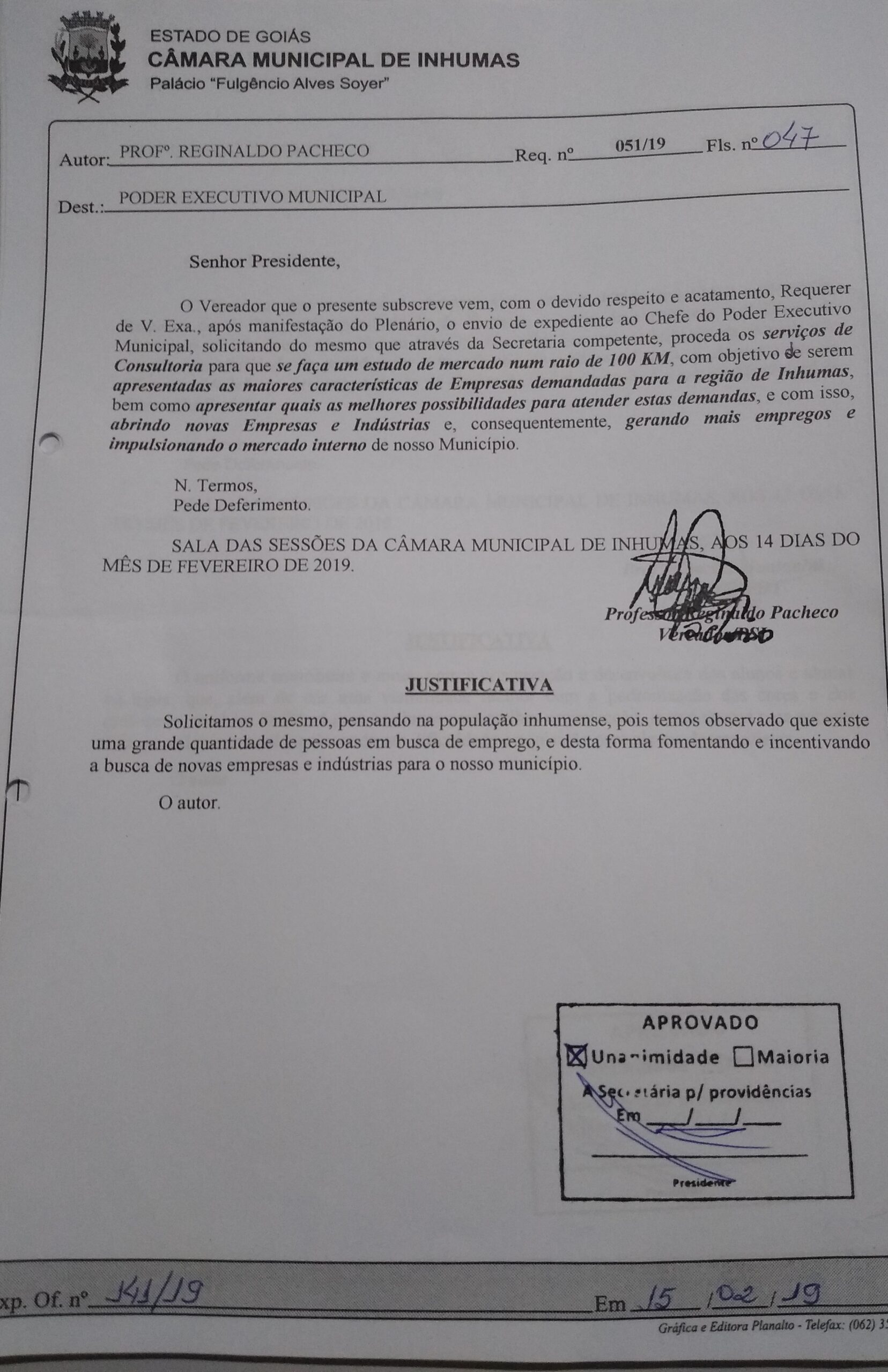 Aprovado por unanimidade em “Sessão Ordinária“ realizada dia14 de Fevereiro, na Câmara Municipal de Inhumas, o “Requerimento n° 051/19“, do vereador Prof. Reginaldo Pacheco (PSL), que solicita o envio de expedienteao Chefe do Poder Executivo Municipal, solicitando do mesmo que através da Secretaria competente, proceda os serviços de Consultoria para que se faça um estudo…