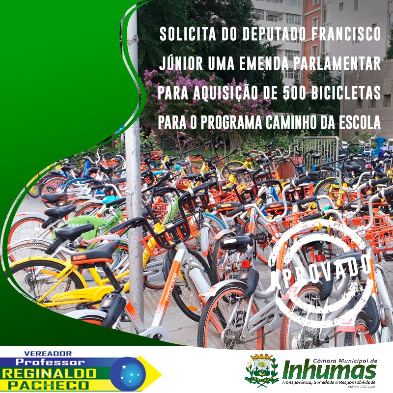 Foi aprovado por unanimidade durante sessão realizada na Câmara Municipal de Inhumas, no último dia 27 de Agosto de 2019, o requerimento de nº. 292/19, de autoria do Vereador Professor Reginaldo (PSL), onde o mesmo solicitou envio de expediente ao Deputado Federal – Sr. Francisco Rodrigues Vale Júnior, requerendo do mesmo que providencie uma EMENDA PARLAMENTAR para aquisição de 500 (quinhentas) bicicletas para o“Programa Caminho da Escola”, objetivando a execução de serviços escolares com o intuito de melhorar o transporte dos nossos alunos de baixa renda.