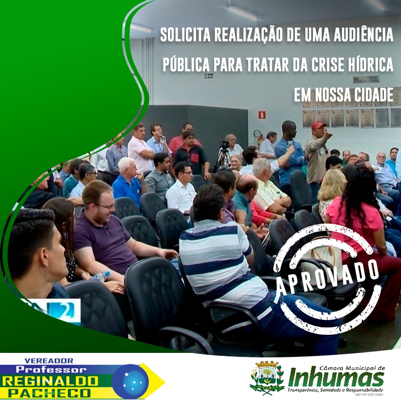 Foi aprovado por unanimidade durante Sessão realizada na Câmara Municipal de Inhumas, no último dia 10 de Setembro de 2019, o Requerimento nº 317/19, de autoria do Vereador Prof. Reginaldo (PSL), onde o mesmo solicita o envio de expediente ao Chefe do Poder Executivo Municipal, solicitando do mesmo que promova uma “AUDIÊNCIA PÚBLICA” com a participação de representantes da SANEAGO, segmentos organizados, entidades de classes e demais órgãos pertinentes ao caso, a ser realizada no Auditório da Prefeitura Municipal de Inhumas, em data e horário a serem agendados pela administração, para que possamos“tratar de assuntos sobre a crise hídrica e também sobre a concessão da SANEAGO”.