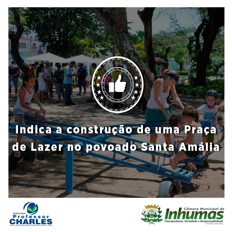 Aprovado por unanimidade em “Sessão Ordinária“ realizada dia 18 de Junho, na Câmara Municipal de Inhumas, o “Requerimento n° 232/19“, do Vereador Professor Charles -PDT, que solicita o envio de expediente INDICA ao Chefe do Poder Executivo Municipal que o mesmo possa viabilizar estudos para “construir” no Povoado de Santa Amália (KM 60), uma “Praça Moderna de Lazer, Cultura e Entretenimento”, gerando e proporcionando a toda comunidade local, um espaço moderno e seguro para que os mesmos possam frequentar.