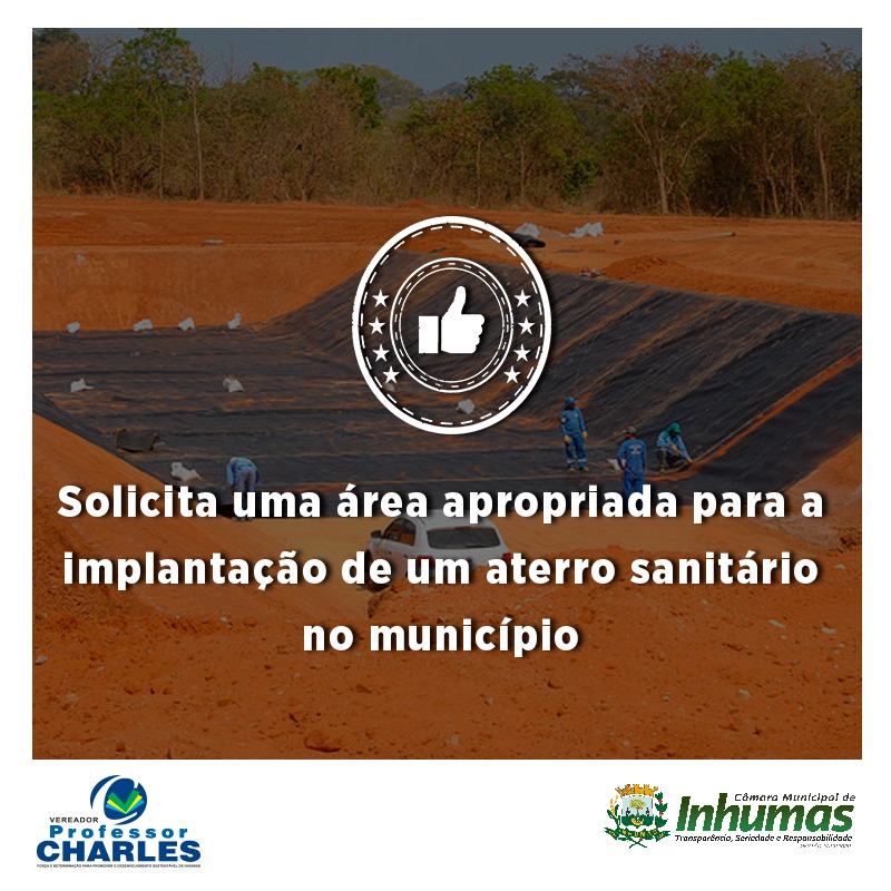 Aprovado por unanimidade em “Sessão Ordinária“ realizada dia 06 de Agosto, na Câmara Municipal de Inhumas, o “Requerimento n° 265/19“, do vereador Professor Charles Montanini – PDT, que solicita o envio de expediente ao Chefe do Poder Executivo Municipal, solicitando do mesmo que destine uma área para implantação de um “aterro sanitário” em nosso Município.