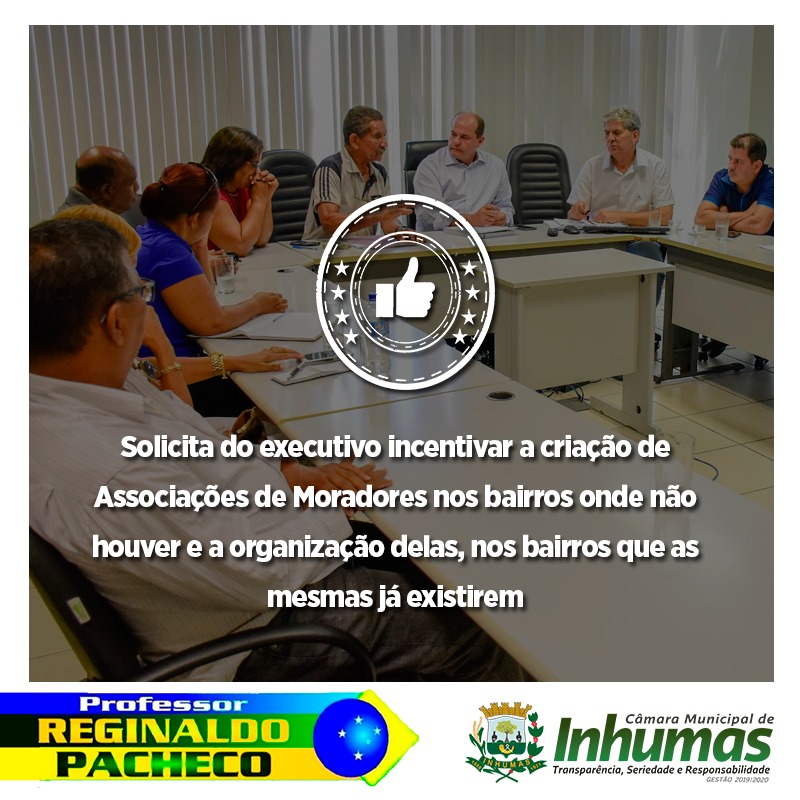 Aprovado por unanimidade em “Sessão Ordinária“ realizada dia 11 de Abril, na Câmara Municipal de Inhumas, o “Requerimento n° 146/19“, do vereador Reginaldo Pacheco (PSL), que solicita o envio de expediente ao Executivo Municipal, solicitando do mesmo que viabilize a criação de ASSOCIAÇÕES DE MORADORES nas regiões aqui inexistentes, e a reorganização das que já existem.