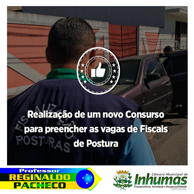 Aprovado por unanimidade em “Sessão Ordinária“ realizada dia 04 de Junho, na Câmara Municipal de Inhumas, o “Requerimento n° 217/19“, do vereador Professor Reginaldo Pacheco – PSL, que solicita o envio de expediente ao Chefe do Poder Executivo Municipal, solicitando do mesmo que através da Secretaria competente, proceda a realização de um novo concurso para prover vagas de Fiscais de Postura, Edificações, Meio Ambiente e Engenheiro Ambiental.
