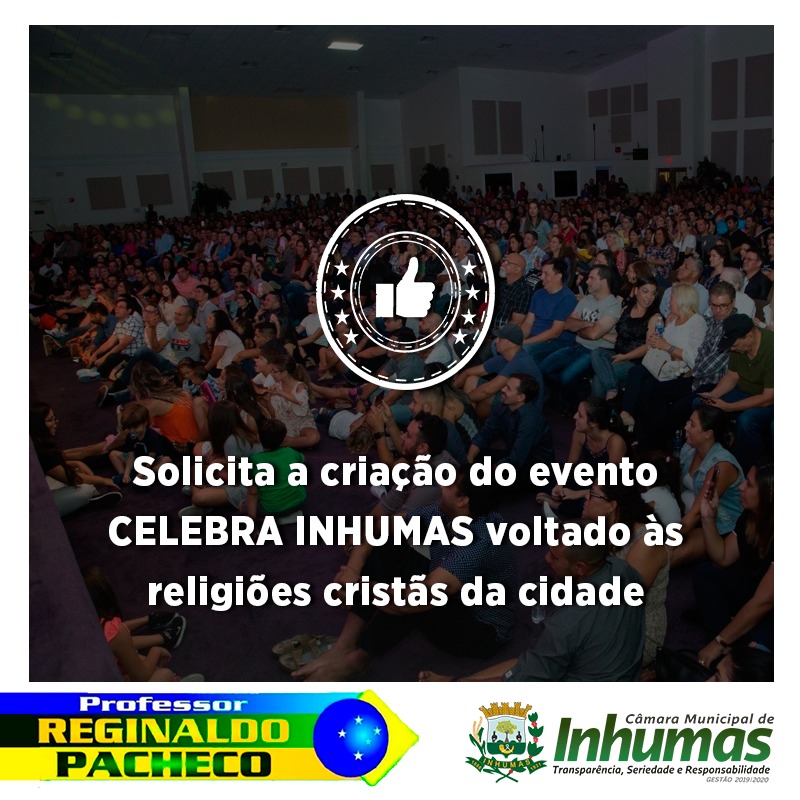 Aprovado por unanimidade em “Sessão Ordinária“ realizada dia 13 de Junho, na Câmara Municipal de Inhumas, o “Requerimento n° 233/19“, do vereador Professor Reginaldo, que solicita o envio de expediente ao chefe do Poder Executivo Municipal, solicitando do mesmo que através da Secretaria competente, proceda a realização de um evento de âmbito municipal celebrando a comunhão entre as diversas crenças cristãs, intitulado “CELEBRA, INHUMAS!”, sendo este evento a ser feito no “último fim de semana do mês de Setembro, ou seja, na sexta-feira as atrações espíritas, no sábado as atrações evangélicas e no domingo as atrações católicas, tendo palestras e shows de renome nacional nos 03 (três) dias.