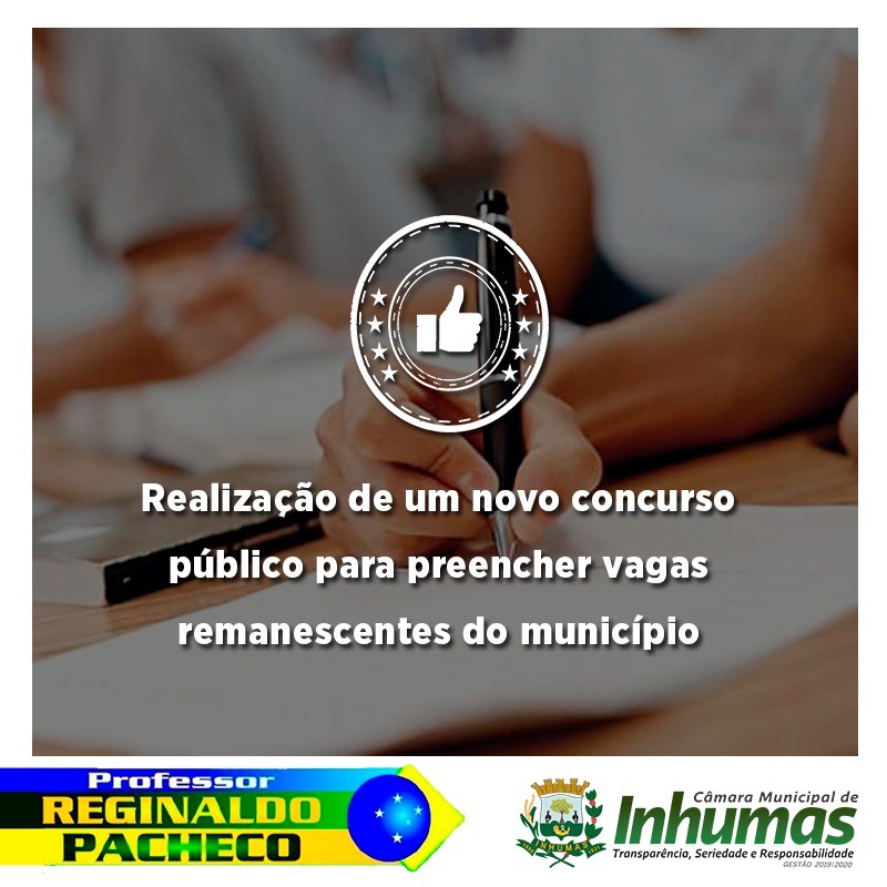 Aprovado por unanimidade em “Sessão Ordinária“ realizada dia 28 de Março, na Câmara Municipal de Inhumas, o “Requerimento n° 118/19“, do vereador Reginaldo Pacheco (PSL), que solicita o envio de expediente ao Chefe do Poder Executivo Municipal, solicitando do mesmo que através da Secretaria competente, proceda a realização de um “novo Concurso” para prover vagas…