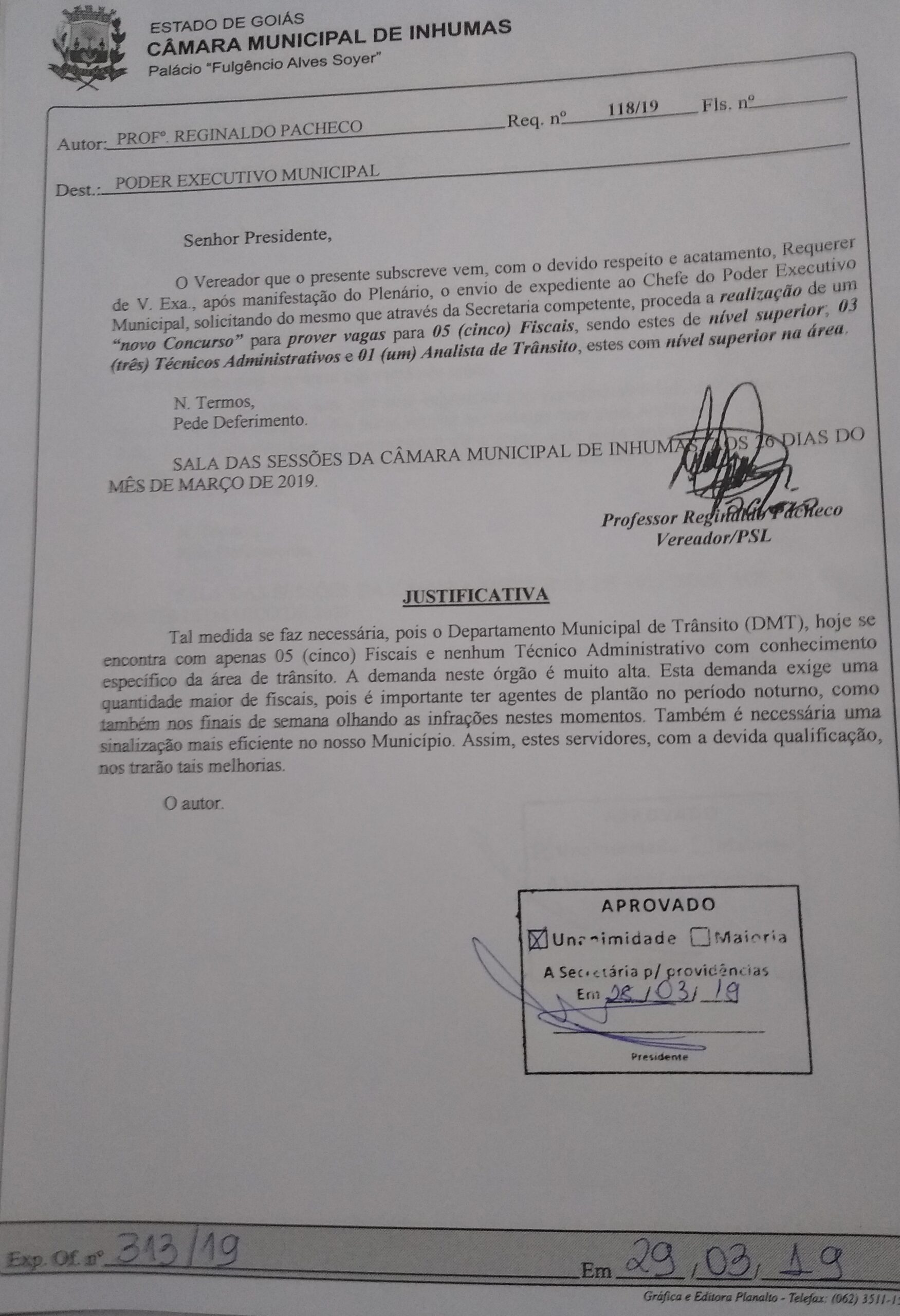 Aprovado por unanimidade em “Sessão Ordinária“ realizada dia 28 de Março, na Câmara Municipal de Inhumas, o “Requerimento n° 118/19“, do vereador Reginaldo Pacheco (PSL), que solicita o envio de expediente ao Chefe do Poder Executivo Municipal, solicitando do mesmo que através da Secretaria competente, proceda a realização de um “novo Concurso” para prover vagas para 05 (cinco) Fiscais, sendo estes de nível superior; 03 (três) Técnicos Administrativos e 01 (um) Analista de Trânsito,estes com nível superior na área.