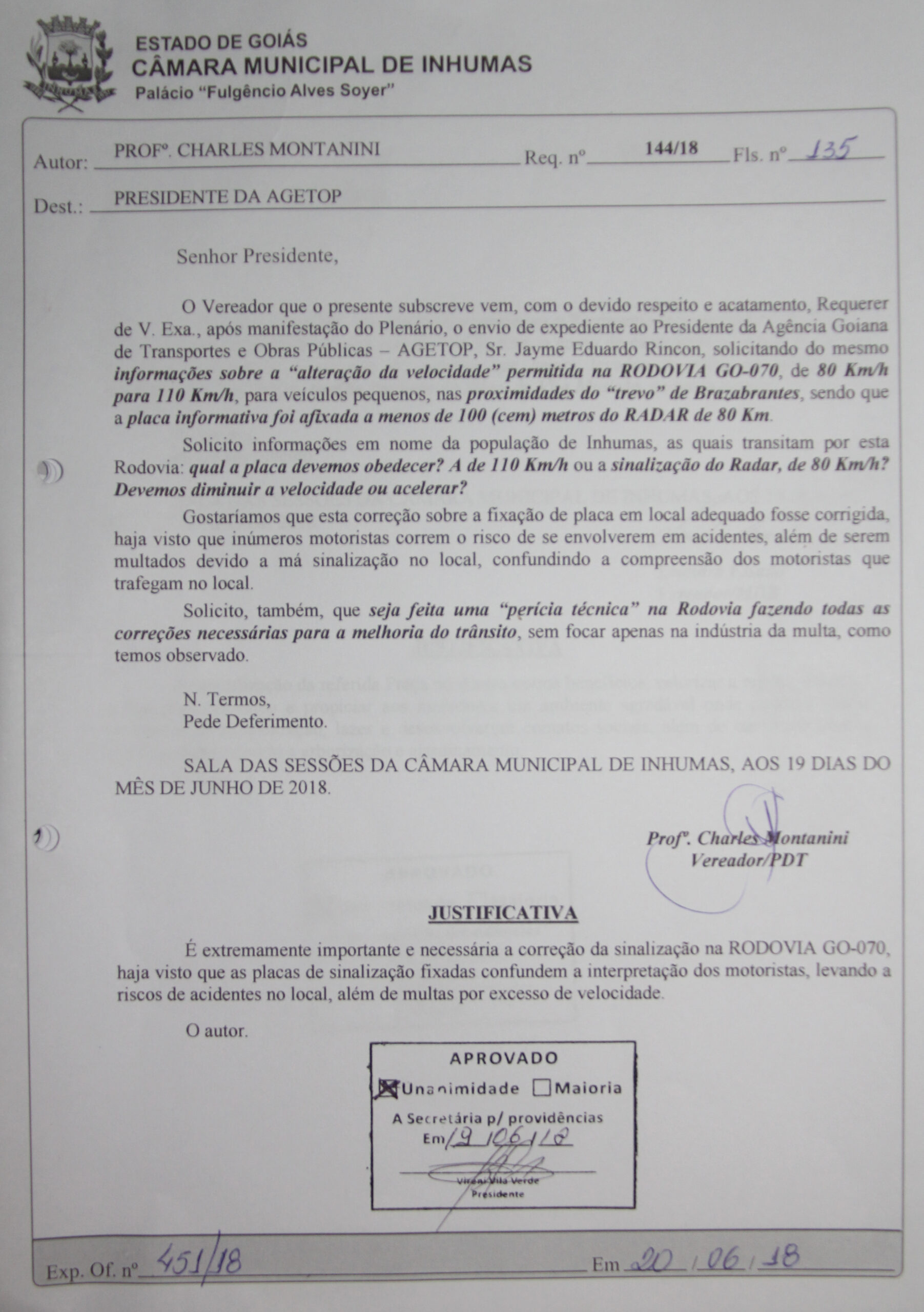 Em busca de maiores informações os vereadores da Câmara Municipal de Inhumas aprovaram por unanimidade dia 19, o “Requerimento de n. 144/18, do vereador Prof. Charles Montanini (PDT) que requer o envio de expediente ao Presidente da Agência Goiana de Transportes e Obras Públicas (AGETOP), Sr. Jayme Eduardo Rincon, solicitando informações sobre a “alteração da velocidade” permitida na Rodovia GO-070, de 80 Km/h para 110 Km/h, para veículos pequenos, nas proximidades do “trevo” de Brazabrantes, sendo que a placa informativa foi afixada a menos de 100 (cem) metros do radar de 80 Km.