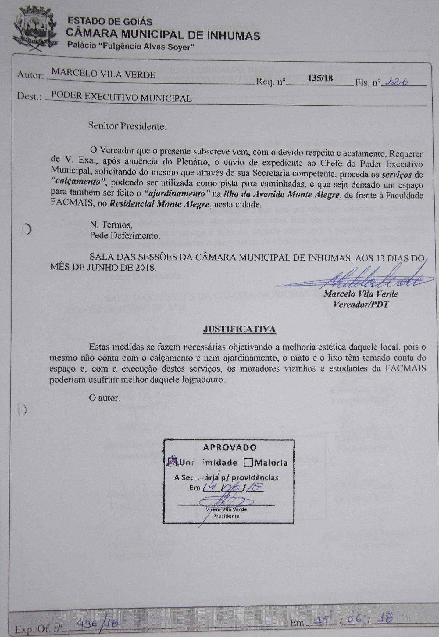 Aprovado por unanimidade em “Sessão Ordinária“ realizada dia 14, na Câmara Municipal de Inhumas, o “Requerimento n° 135/18“, do vereador Marcelo Vila Verde (PDT), que solicita o envio de expediente ao Chefe do Poder Executivo Municipal, solicitando do mesmo que através de sua Secretaria competente, proceda os serviços de “calçamento”, podendo ser utilizada como pista para caminhadas, e que seja deixado um espaço para também ser feito o “ajardinamento” na ilha da Avenida Monte Alegre, de frente à Faculdade FACMAIS, no Residencial Monte Alegre, nesta cidade.