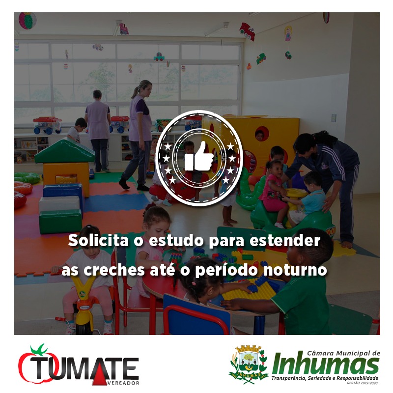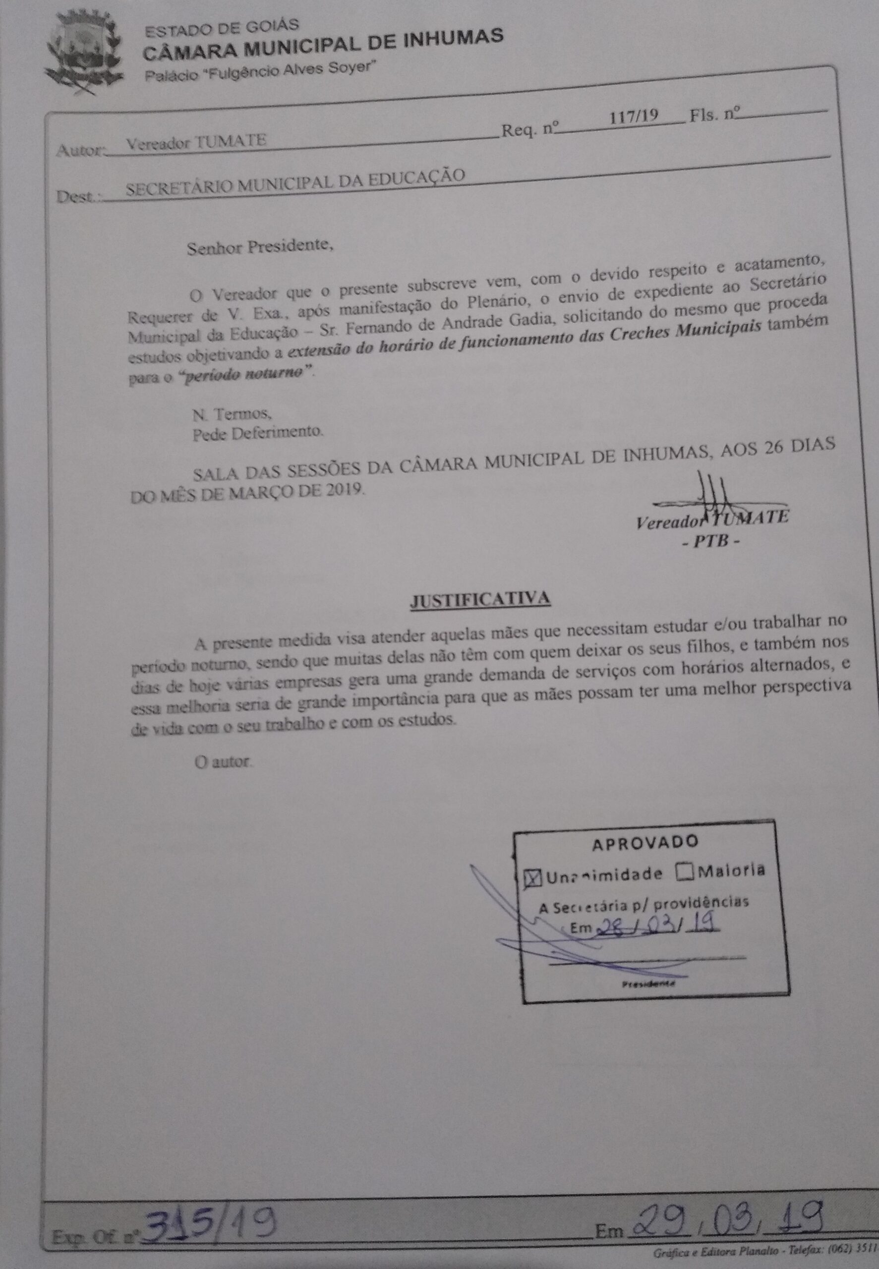 Aprovado por unanimidade em “Sessão Ordinária“ realizada dia 28 de Março, na Câmara Municipal de Inhumas, o “Requerimento n° 117/19“, do vereador Tumate (PTB), que solicita o envio de expediente ao Secretário Municipal da Educação – Sr. Fernando de Andrade Gadia, solicitando do mesmo que proceda estudos objetivando a extensão do horário de funcionamento das Creches Municipais também para o “período noturno”.