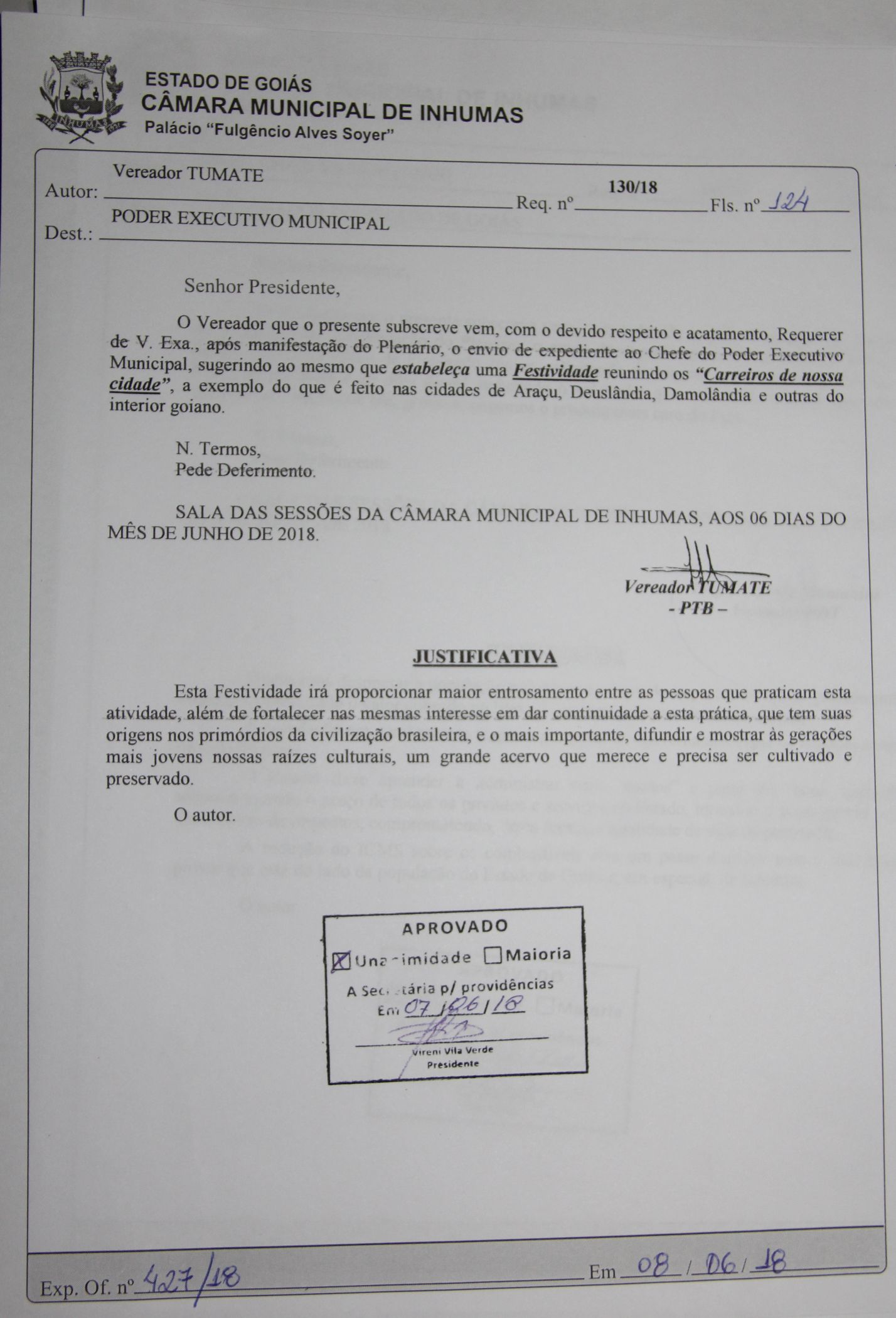 Aprovado por unanimidade, o “Requerimento de n. 130/18” do vereador Tumate (PTB), durante “Sessão Ordinária” realizada dia 07 de junho, na Câmara Municipal de Inhumas.