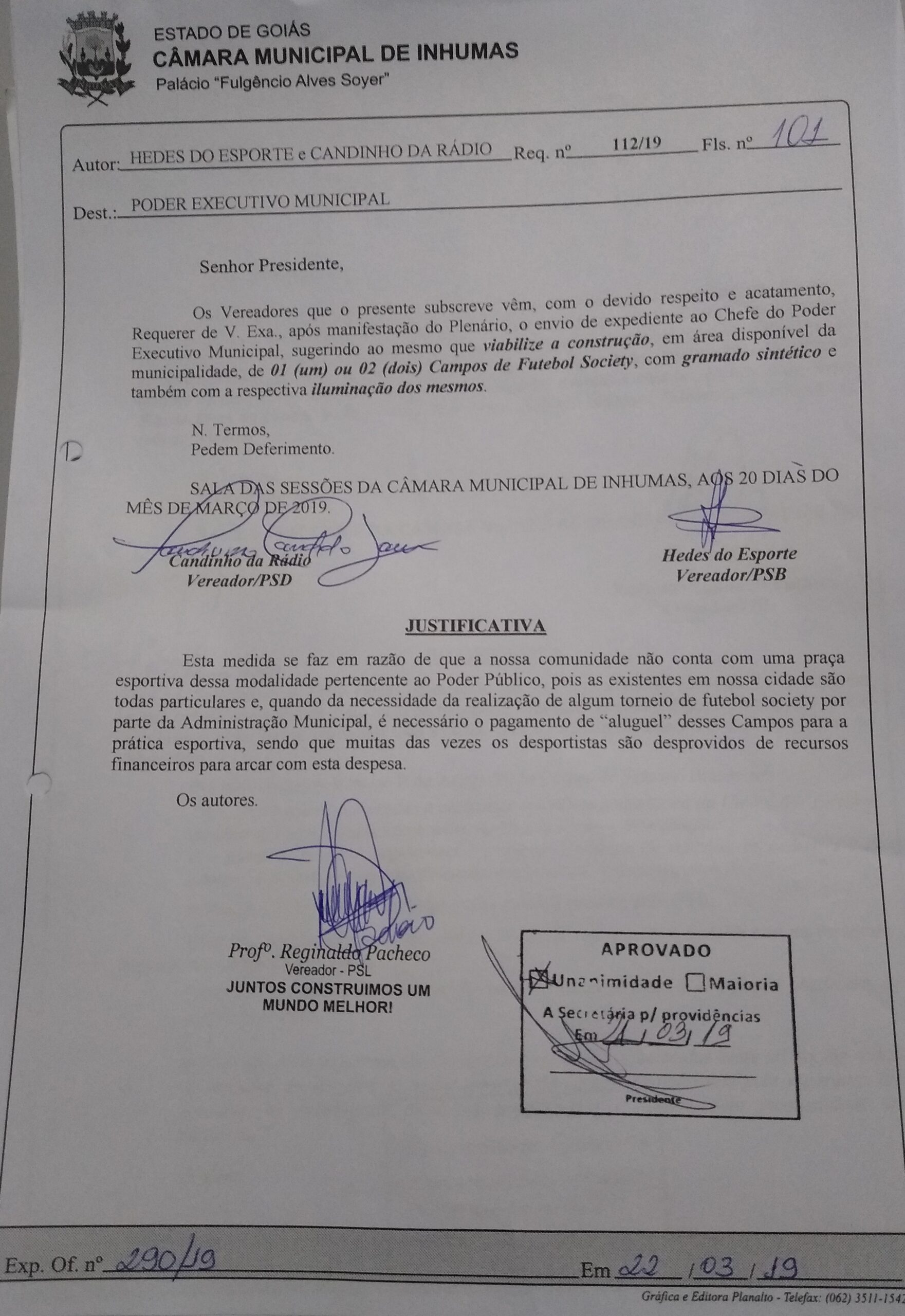 Aprovado por unanimidade em “Sessão Ordinária“ realizada dia 21 de Março, na Câmara Municipal de Inhumas, o “Requerimento n° 112/19“, dos vereadores Candinho da Rádio (PSD) e Hedes do Esporte (PSB), que solicita o envio de expediente ao Chefe do Poder Executivo Municipal, sugerindo ao mesmo que viabilize a construção, em área disponível da municipalidade, de 01 (um) ou 02 (dois) Campos de Futebol Society, com gramado sintético e também com a respectiva iluminação dos mesmos.