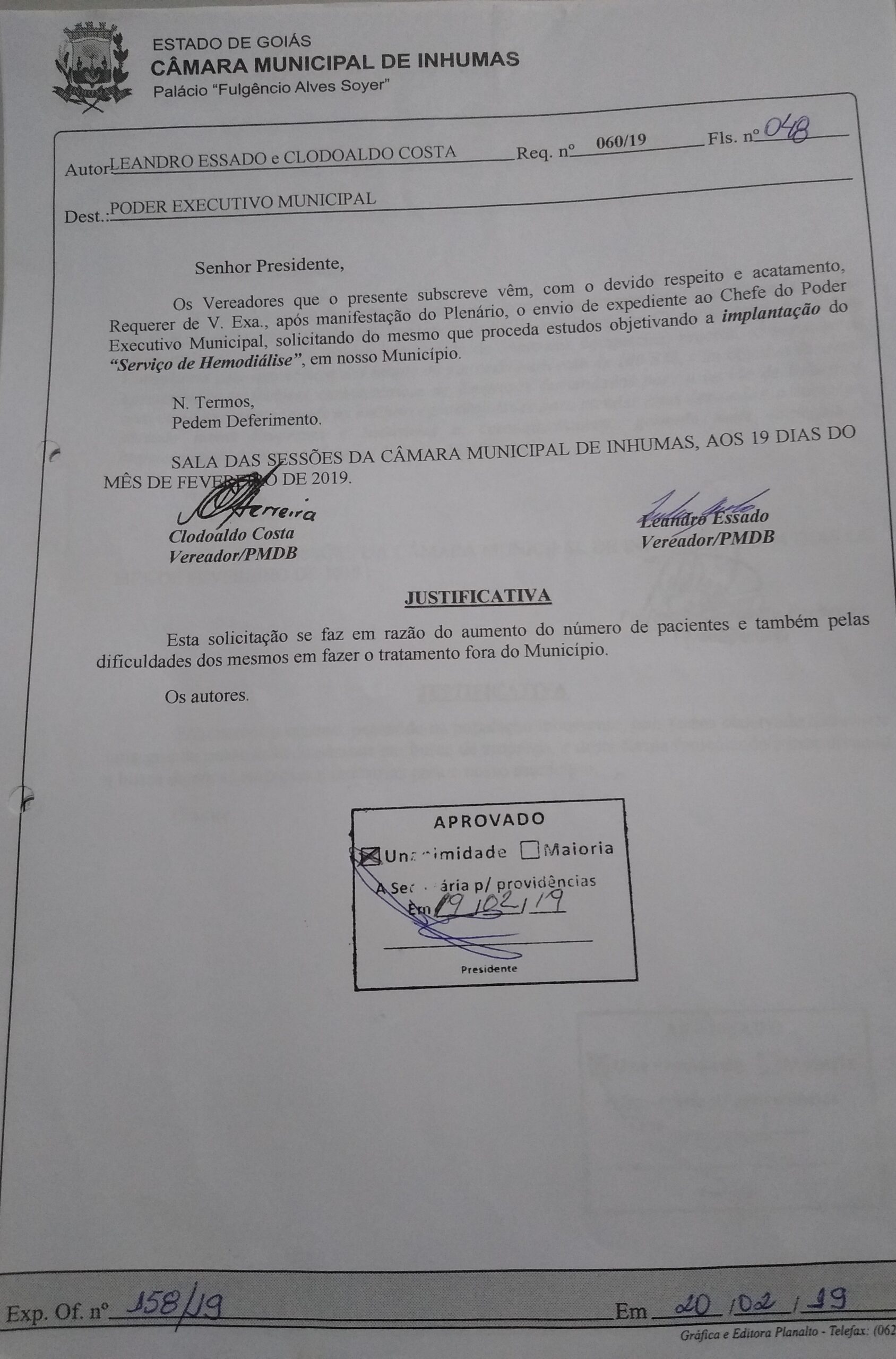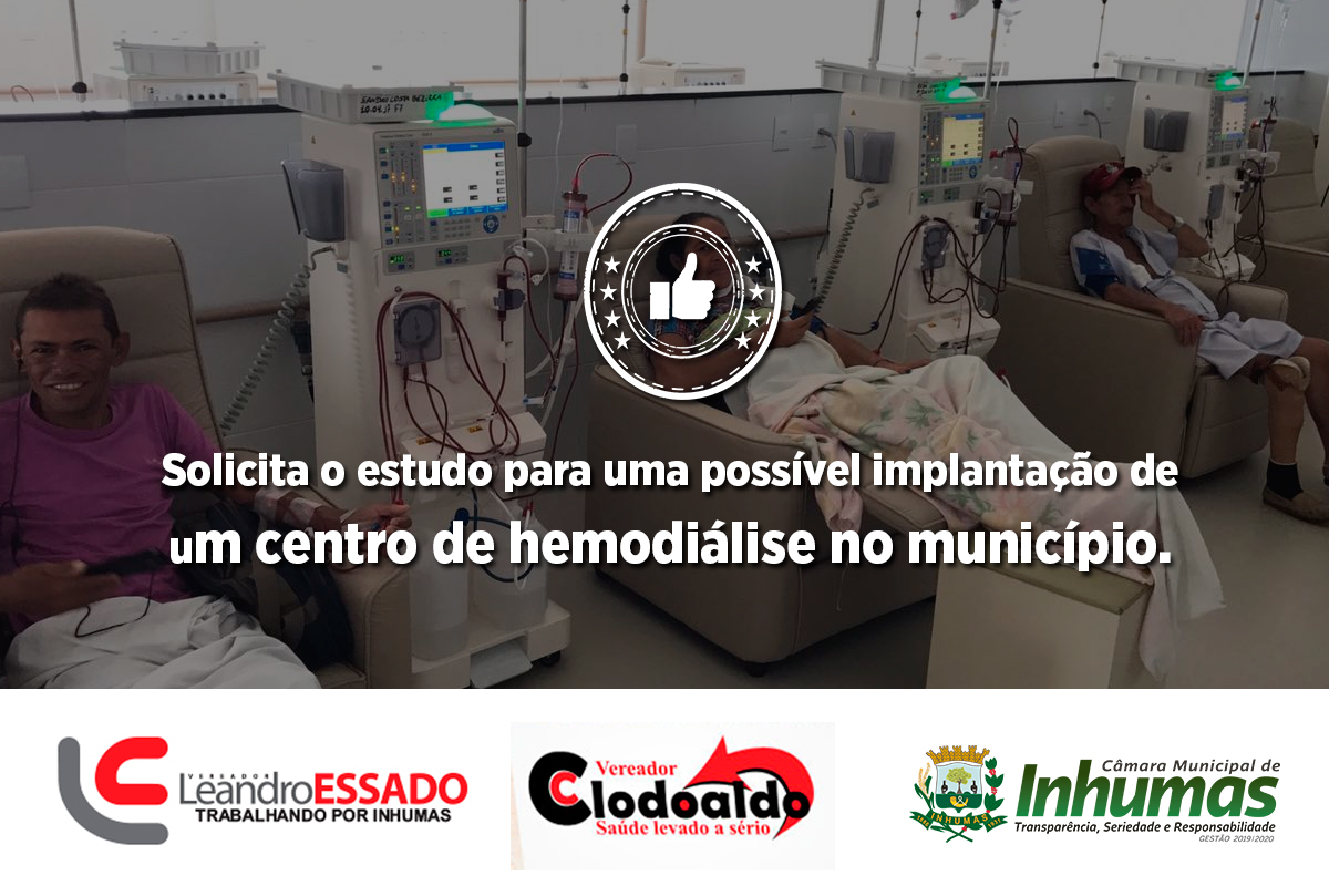 Aprovado por unanimidade em “Sessão Ordinária“ realizada dia 19 de Fevereiro, na Câmara Municipal de Inhumas,  o “Requerimento n° 060/19“,  dos vereadores Leandro Essado (MDB) e Clodoaldo Costa (MDB), que solicita o envio de expediente ao Chefe do Poder Executivo Municipal, solicitando do mesmo que proceda estudos objetivando a implantação do “Serviço de Hemodiálise”, em nosso Município.