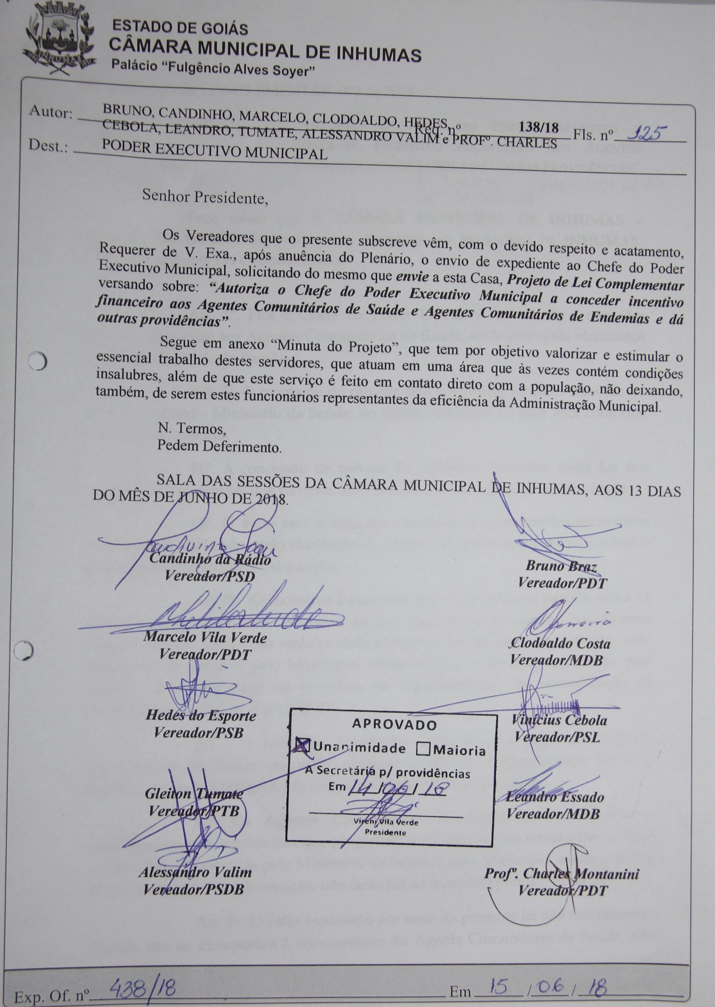 Aprovado por unanimidade dia 14, na Câmara Municipal de Inhumas o  “Requerimento n° 138/18”, uma propositura  em conjunto os vereadores:  Alessandro Valim (PSDB), Bruno Braz (PDT), Candinho da Rádio (PSD), Clodoaldo Costa (MDB), Charles Montanini (PDT), Hedes do Esporte (PSB), Vinícius Cebola (PSL), Leandro Essado (MDB), Tumate (PTB) e Marcelo Vila Verde (PDT) que requerem o envio de expediente ao Chefe do Poder Executivo Municipal, solicitando do mesmo que envie a Casa de Leis – Câmara Municipal de Inhumas-, um Projeto de Lei Complementar versando sobre: “Autoriza o Chefe do Poder Executivo Municipal a conceder incentivo financeiro aos Agentes Comunitários de Saúde e Agentes Comunitários de Endemias e dá outras providências”.