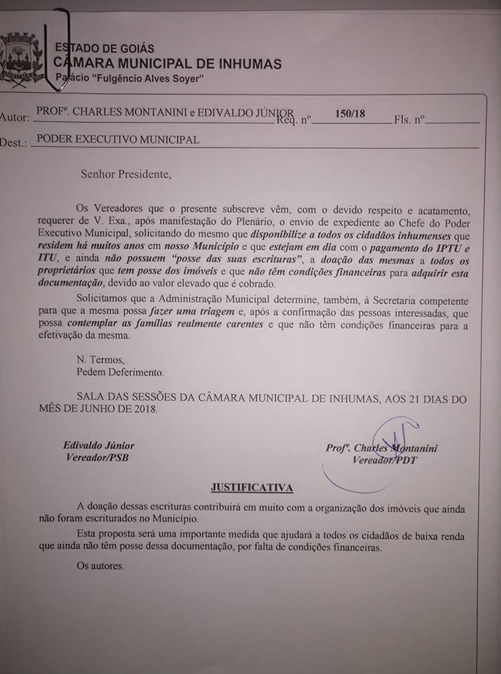 Os vereadores requerem o envio de expediente ao Chefe do Poder Executivo Municipal, solicitando do mesmo que disponibilize a todos os cidadãos inhumenses que residem há muitos anos em nosso Município e que estejam em dia com o pagamento do IPTU e ITU, e ainda não possuem “posse das suas escrituras”, a doação das mesmas a todos os proprietários que tem posse dos imóveis e que não têm condições financeiras para adquirir esta documentação, devido ao valor elevado que é cobrado.